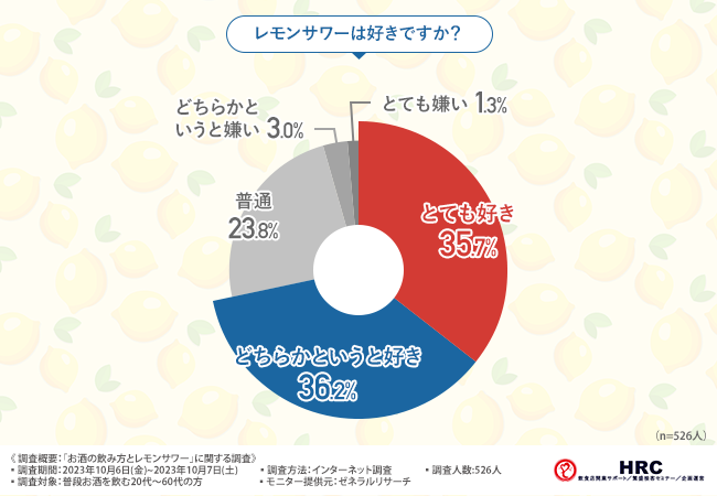 「レモンサワーは好きですか?」と質問したところ、『どちらかというと好き(36.2%)』と回答した方が最も多く、次いで『とても好き(35.7%)』『普通(23.8%)』『どちらかというと嫌い(3.0%)』『とても嫌い(1.3%)』と続きました。