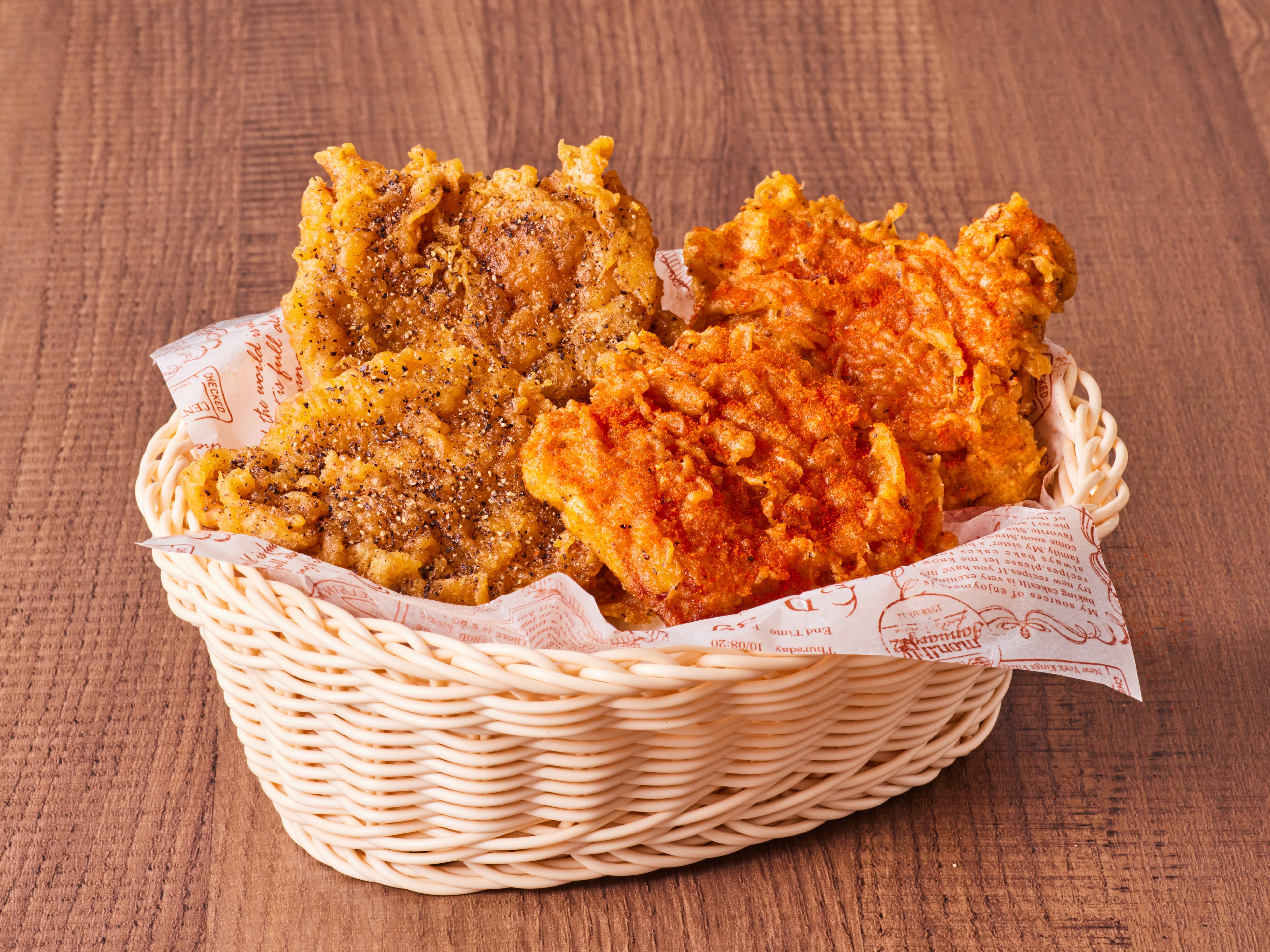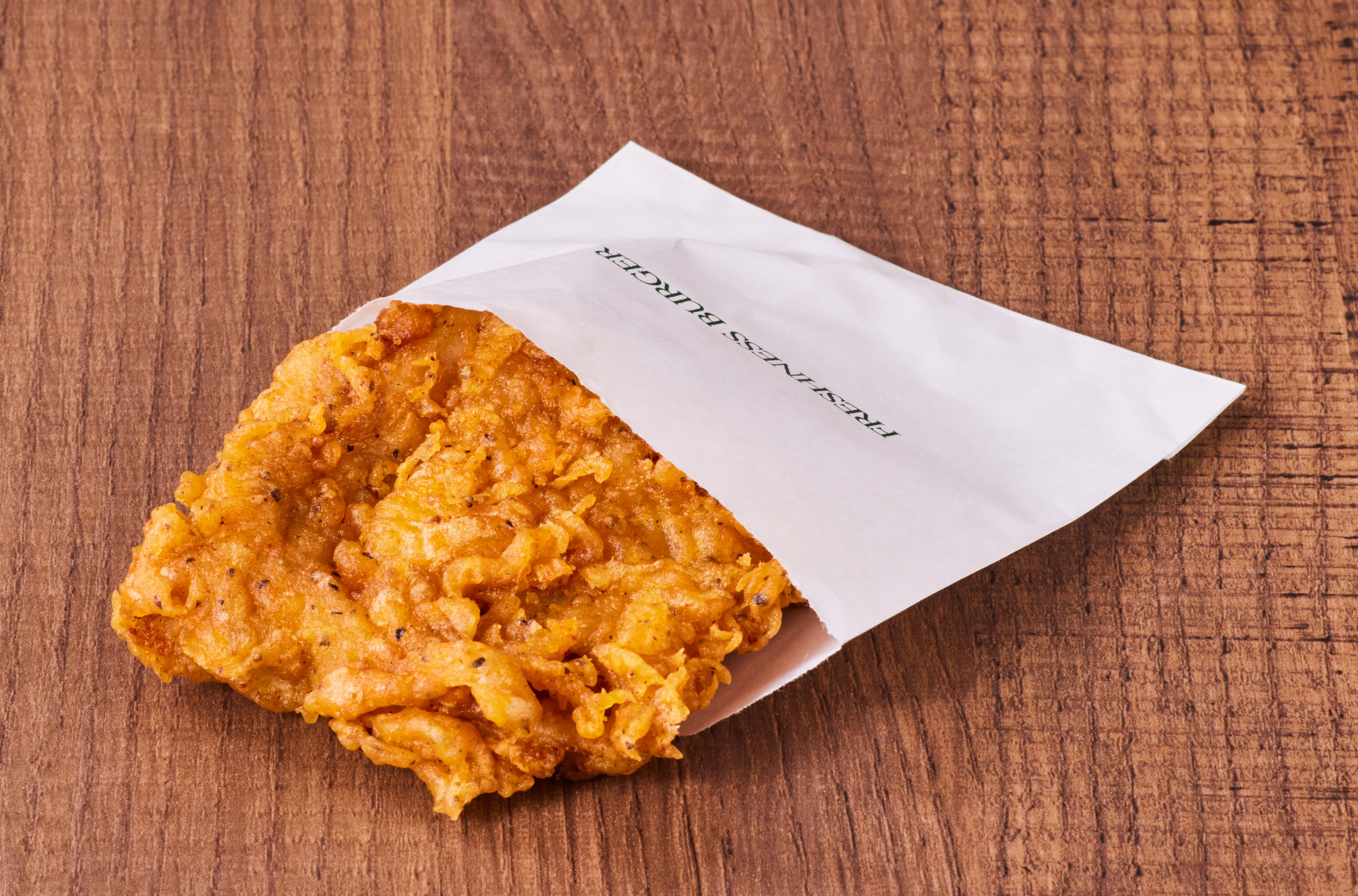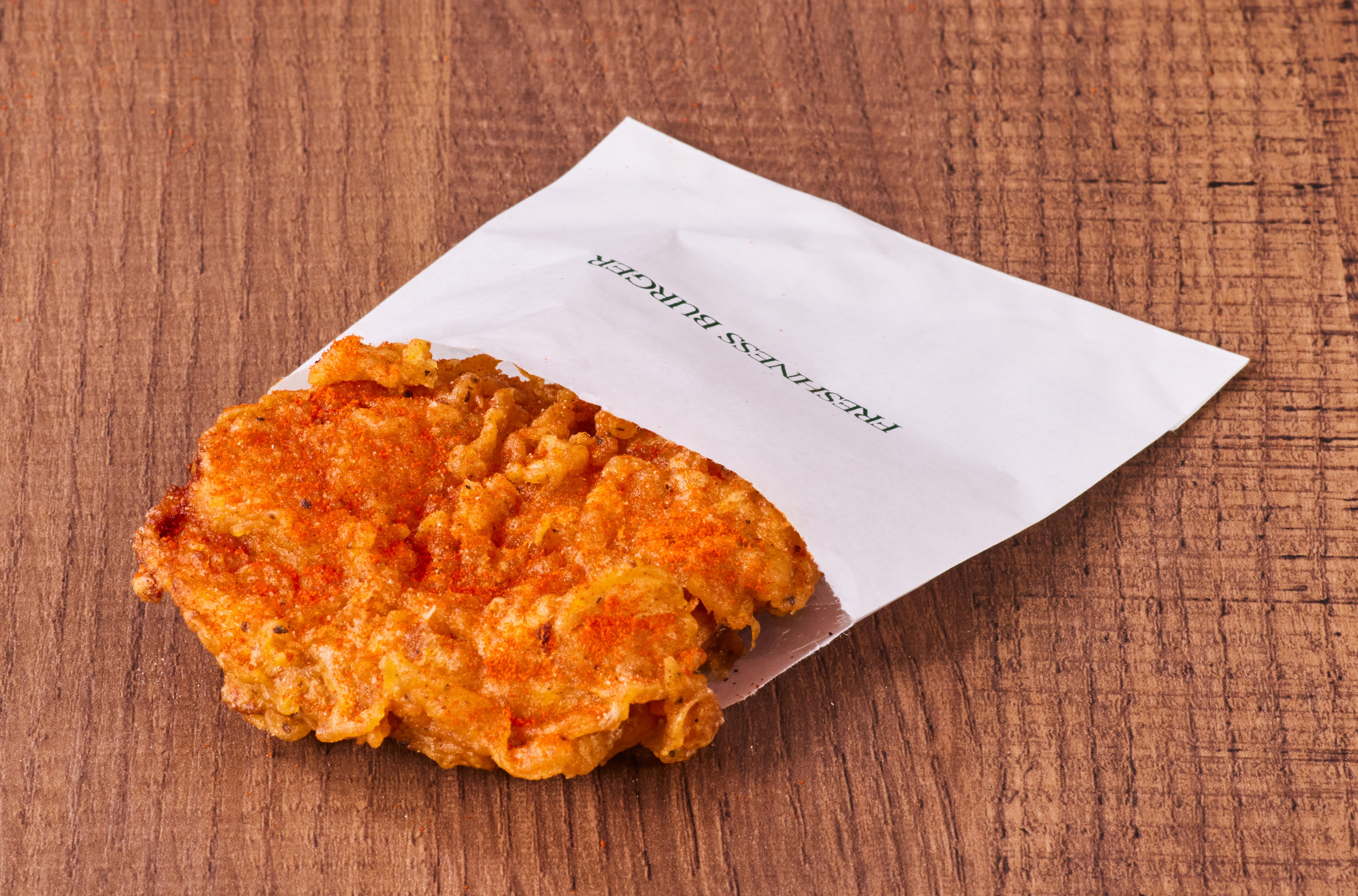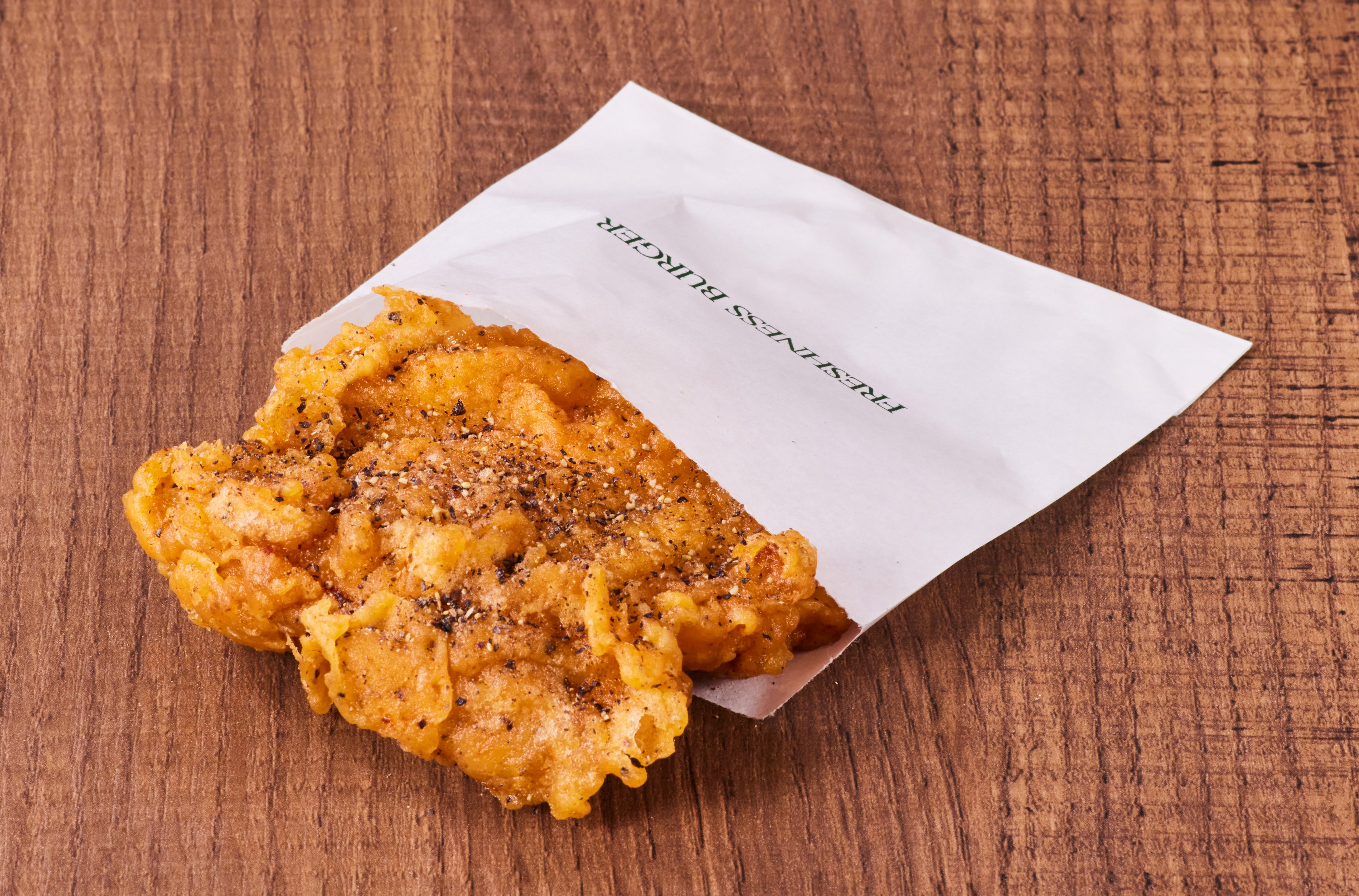 フレッシュネスのチキンは、「サイ」と呼ばれる若鶏の上もも肉を使用。プリッとした弾力と肉厚ジューシーで身が柔らかく、食べ応えのある部位です。チキンの美味しさを最大限に生かすため、下味には日本人に馴染み深い白味噌を隠し味として使い、8種類のスパイスを配合した特製の衣をつけ、店内で1枚ずつ丁寧に揚げて提供しています。スパイシーでザクッと食感のクリスピーな衣は、飽きがこないやみつきになる美味しさです。