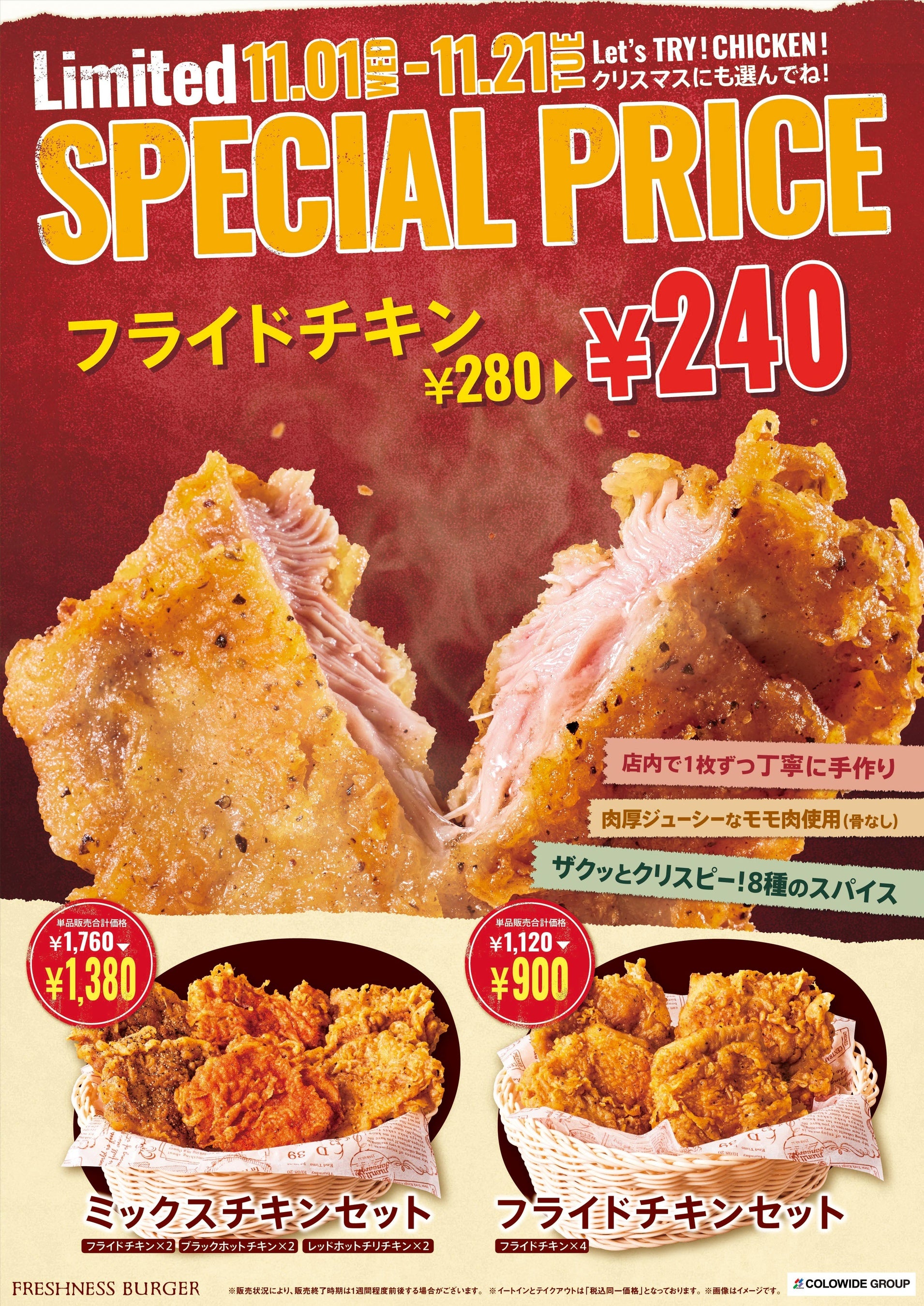 ぜひクリスマス前のこのお得なキャンペーン中に、フレッシュネスのこだわりのチキンをお召し上がりください。