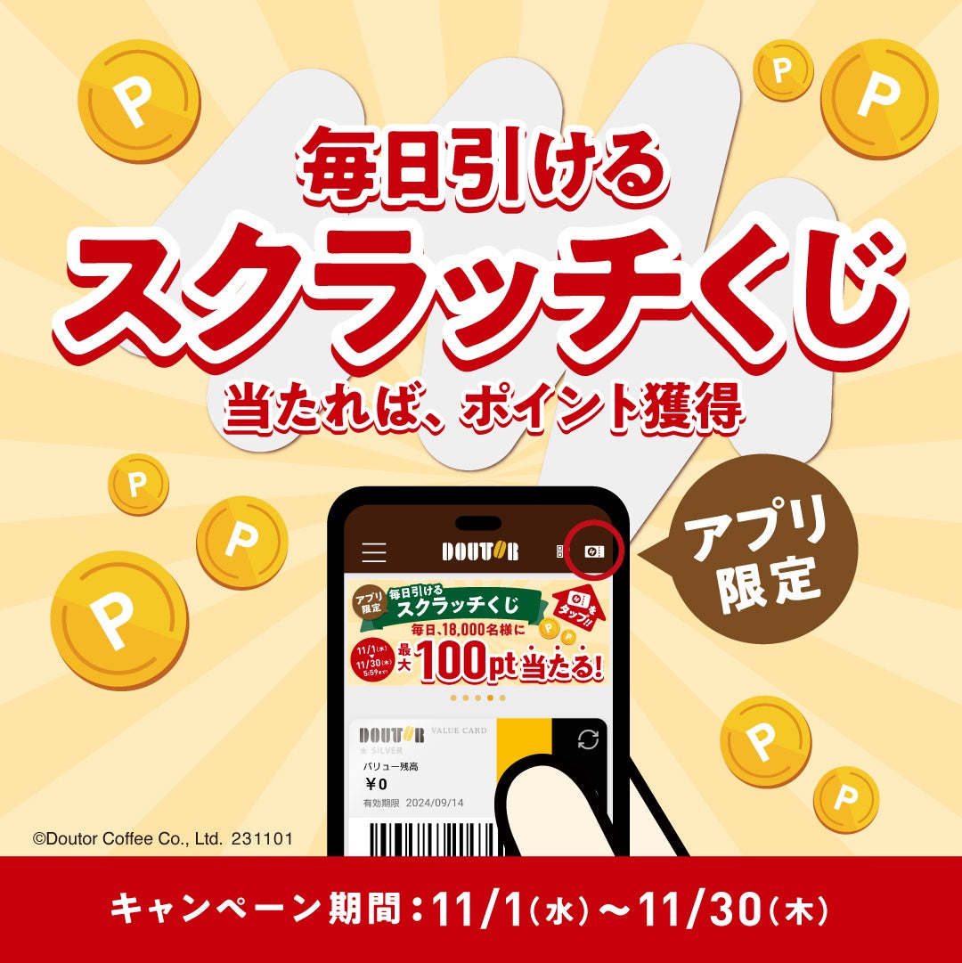また同期間中に、ドトール バリューカードアプリ限定で毎日20,000名様にドトール バリューポイントが当たる!「毎日引けるスクラッチくじ」を開催。ドトール バリューカードアプリの登録がまだの方は、この機会にぜひ登録しておトクなキャンペーンにご参加ください。