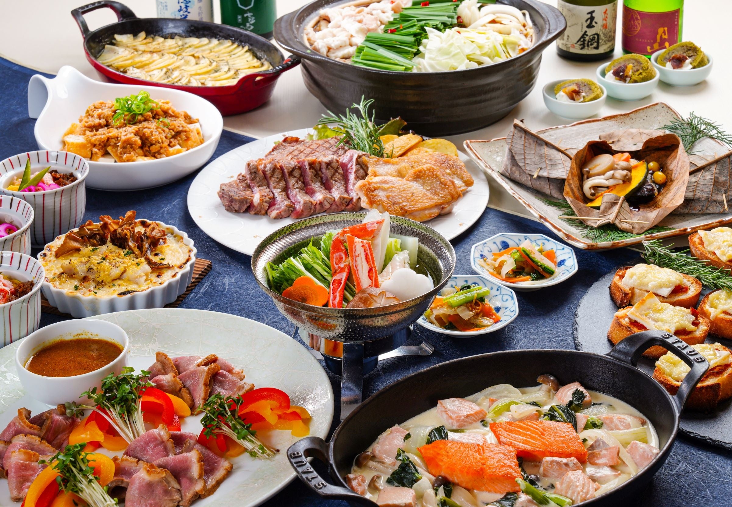 12月31日までの料理には、魚介の旨味がたっぷりの「蟹と白身魚のブイヤベース」、キノコたっぷりのソースをかけた「チキングリル ソースデュクセル」、煮込んだ豚肉の旨味がじゃがいもに溶け込んだ「豚肉のシャンヴァロン風」、甘酸っぱい「ラズベリーブランマンジェ」など、洋食メニューを中心にご用意いたします。一方、1月は、身体の芯から温まる「蟹入り小鍋」や「もつ鍋」、合鴨を蒸し煮にして、出汁入りの和風カレーソースをかける「合鴨カレーソース」、和の要素を取り入れた「抹茶ロールケーキ」や「黒糖プディング」など、和食メニューを中心にご用意いたします。