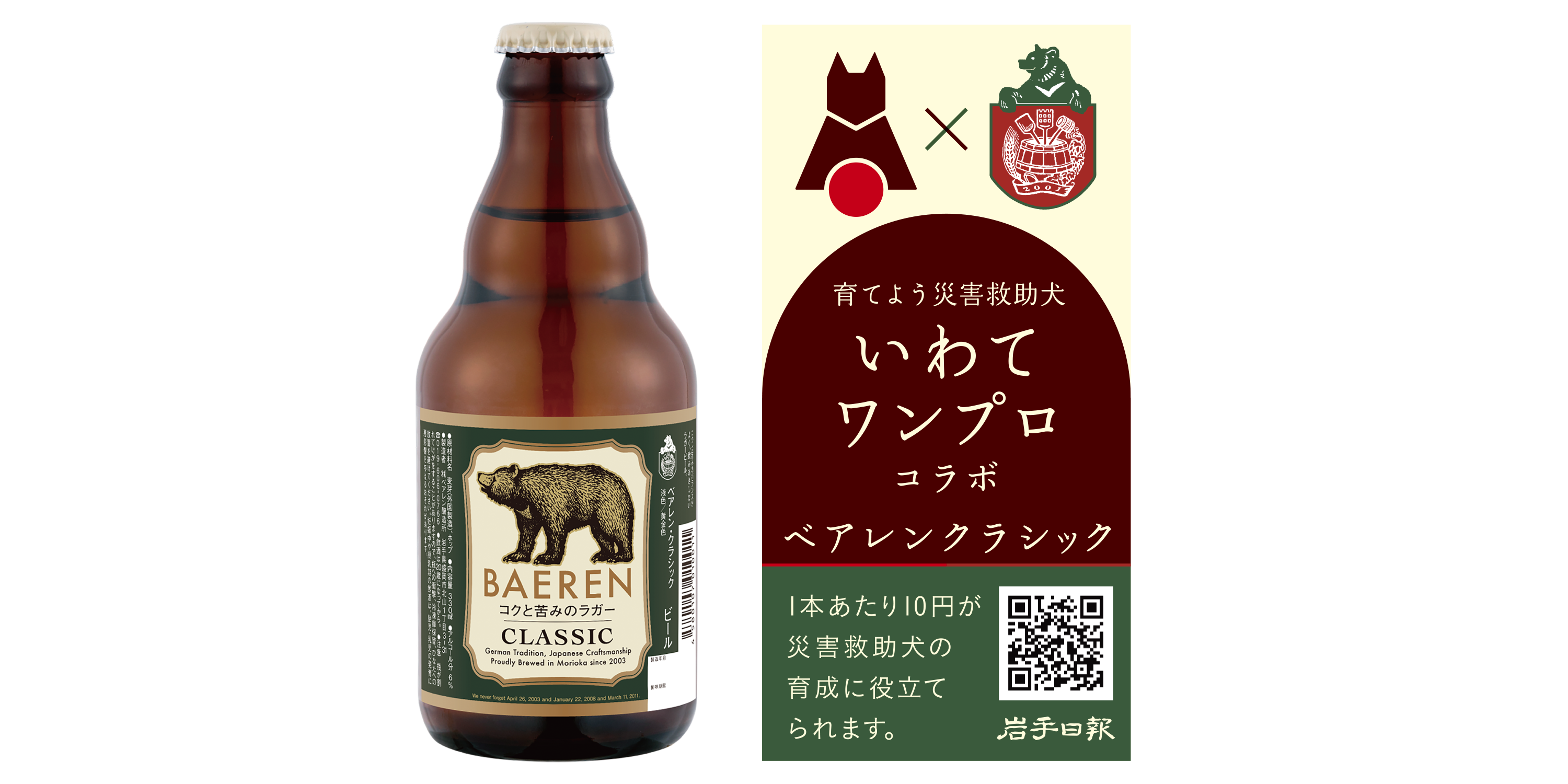 このたび、支援の一環としていわてワンプロのオリジナルラベルを掲げた「ベアレンクラシック」を発売し、売り上げ1本当たり10円を寄付いただき、災害救助犬育成に役立ててまいります。