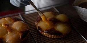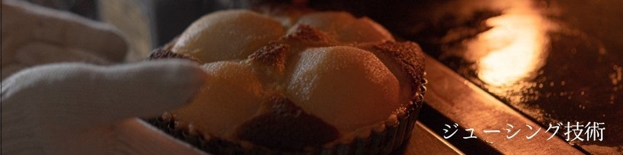 完熟のラ・フランスを、生のままタルト生地に載せて焼き上げるのは技術的に難しいのですが、生のまま焼くことでオーブンの中で果実とタルトの旨味が混ざり合いお互いの良さを引き出すことができるのです。