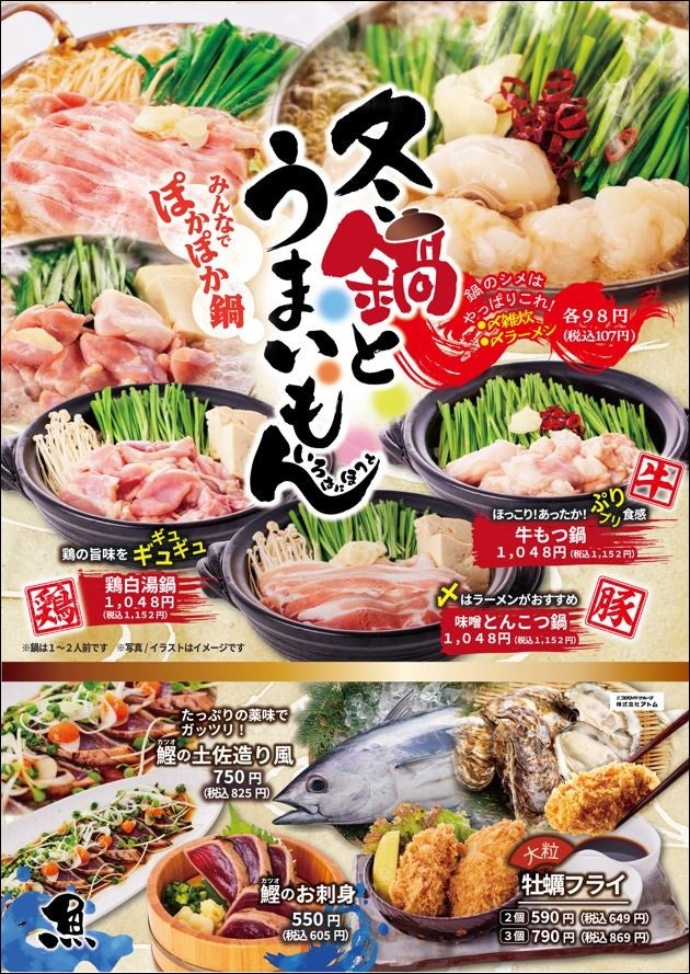 冬の味覚として「大粒カキフライ」を始め、鰹を使用した各種料理や定番あったか鍋、更に今なら「早得宴会コース」をご用意!ご予約するなら今でしょ!