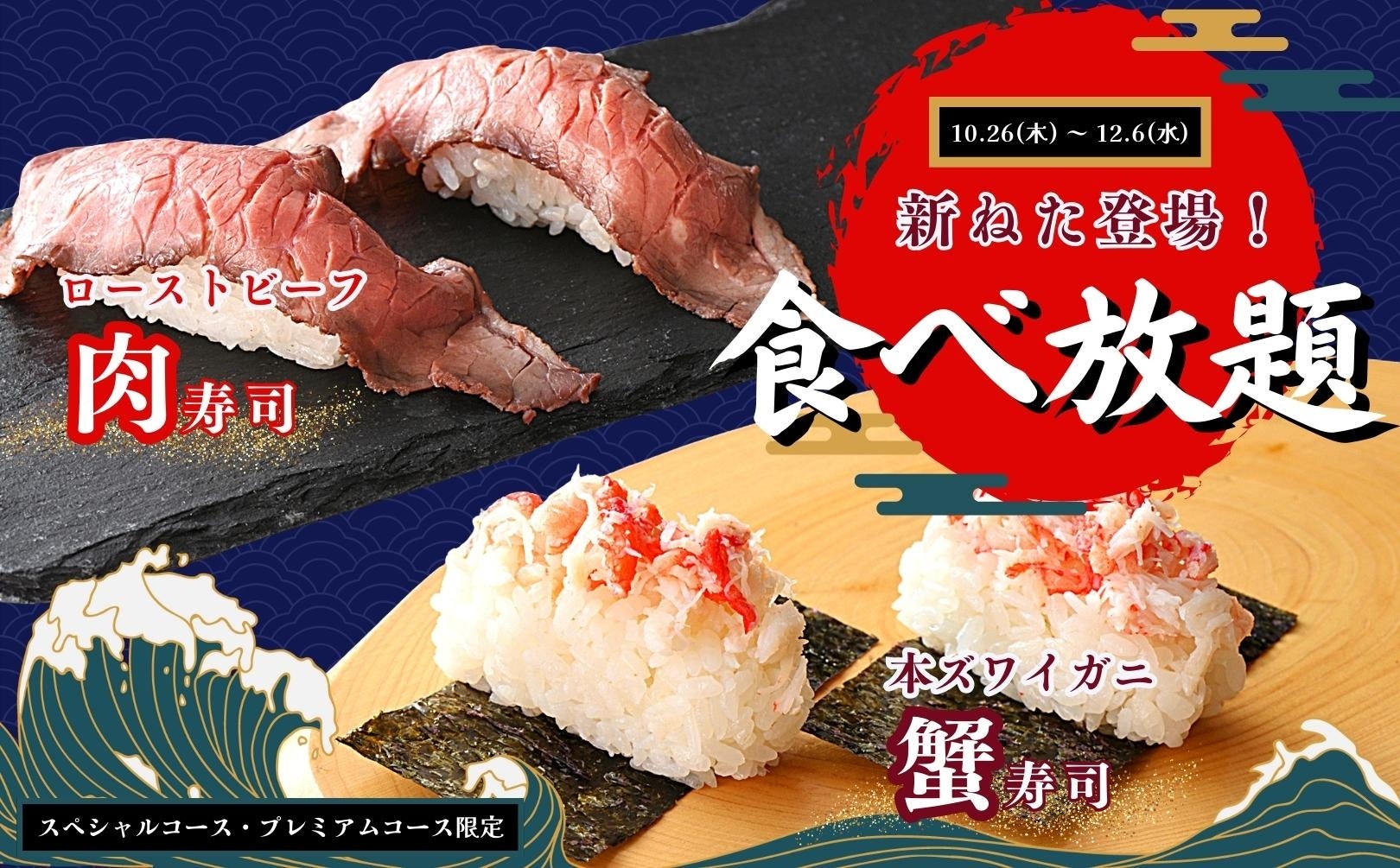 この度、『グランブッフェ』などの23店舗では、2023年10月26日(木)~ 2023年12月6日(水)のスペシャルコース以上のご利用にて、価格はそのまま、寿司食べ放題に『新ねた』が登場いたします!!