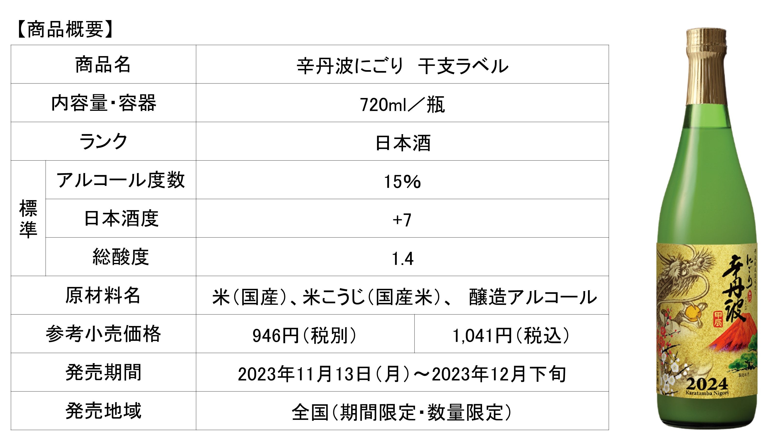大関株式会社(社長:長部訓子/兵庫県西宮市)は、お正月らしく華やかで縁起の良いラベルの「辛丹波にごり720ml瓶詰 干支ラベル」を2023年11月13日(月)から期間限定・数量限定で新発売します。