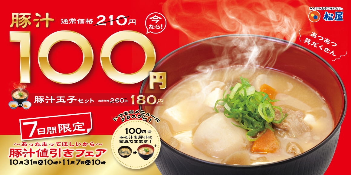 このたび松屋フーズ(本社:東京都武蔵野市、代表取締役社長:瓦葺一利)では、牛めし・カレー・定食・その他丼の「松屋」におきまして、2023年10月31日(火)より1週間の間、「豚汁値引きフェア」を開催いたします。