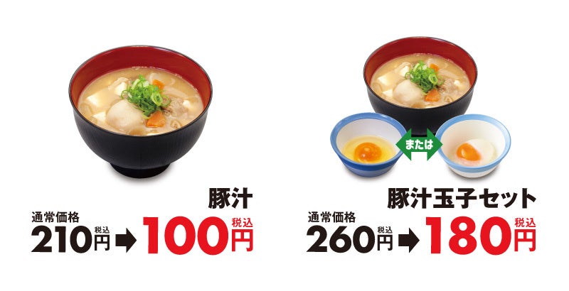 商品名 豚汁 100円 ※通常(210円)の110円引き 豚汁玉子セット 選べる生玉子or半熟玉子 180円 ※通常(260円)の 80円引き ※お持ち帰りいただけます。 ※税込み価格です。