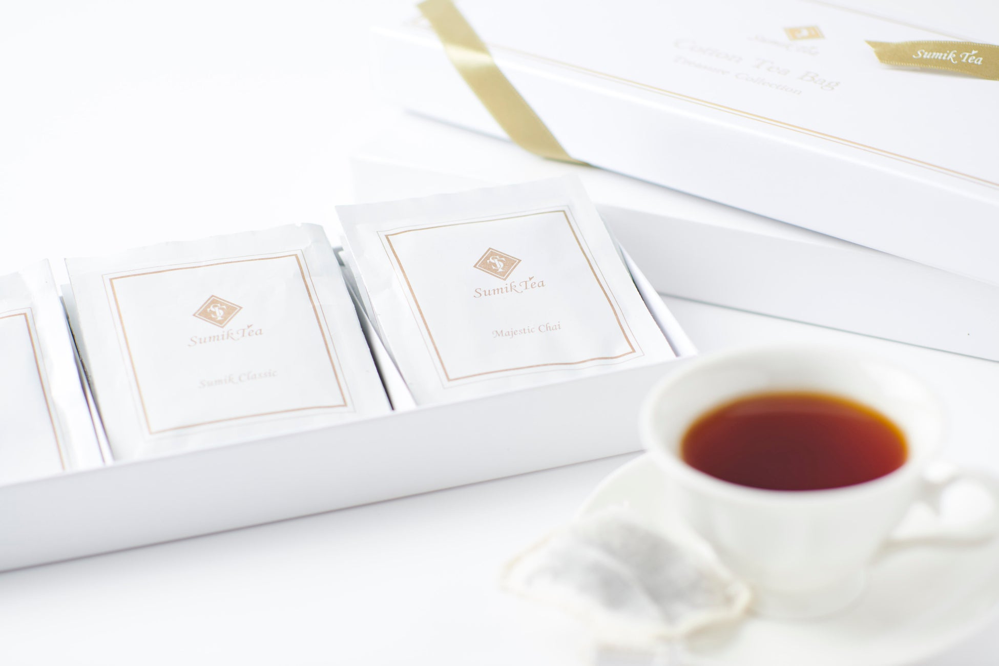 紅茶・コットンともに世界最大の生産国インドで作られた最高級ティーバッグです。無漂白のモスリンコットンで作られたティーバッグは、抽出効率が良いだけでなく雑味を取り除き紅茶の香りと味を引き立てます。Sumik Teaが自信をもって発売する新商品です。