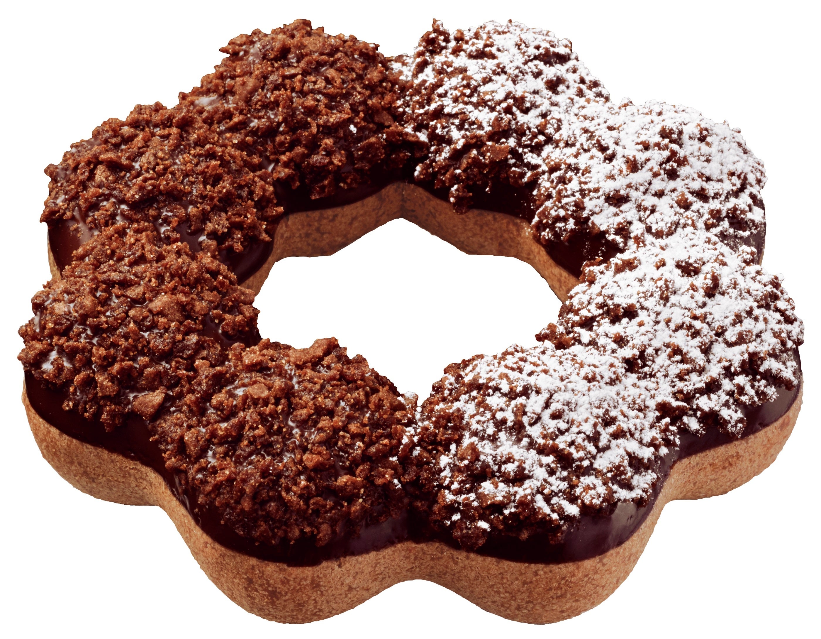 ヘーゼルナッツ風味とバニラ風味が隠し味のもちもち食感のショコラ生地にチョコレートをコーティングし、ザクザクのチョコクランチを全体にトッピング。