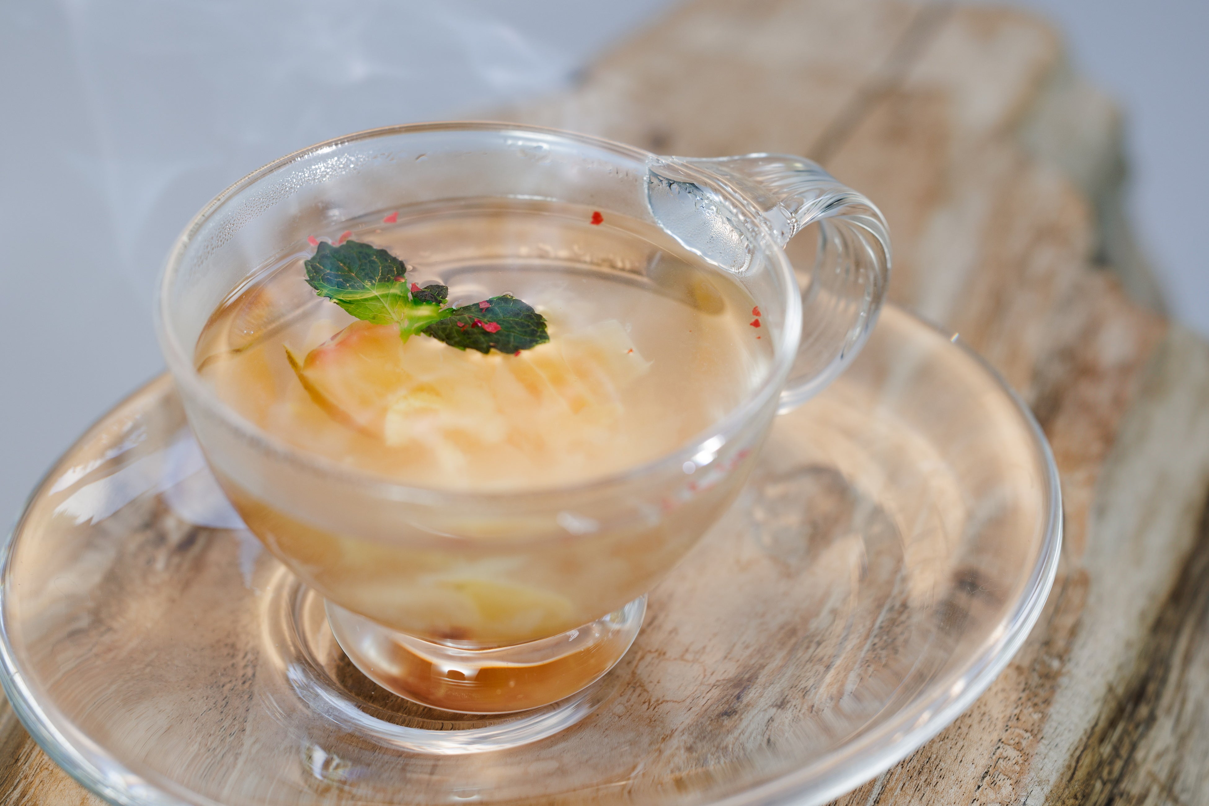一つ目はアップルジンジャーレモネード。スパイスの効いたジンジャーシロップにりんごでまろやかな甘味をプラスしました。さらにレモンを加えることで酸味を足しスッキリとさせました。生姜は冷え性改善、りんごとレモンの抗酸化作用は免疫力アップが期待できます。