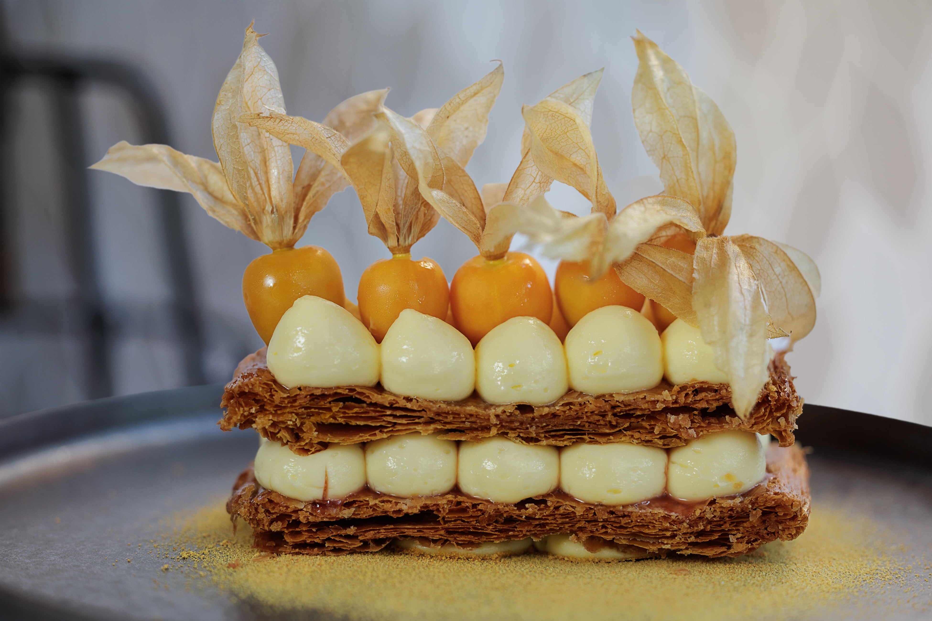 同じく人気の「季節のミルフィーユ」の新作は、フレッシュな鬼灯と香り豊かなマンダリンクリームで秋を感じる一品。黄金色の鬼灯は、ほんのり甘酸っぱく、種のプチプチした食感がほどよいアクセントに。酸味と甘味が絶妙なバランスで、少し苦みのあるマンダリンクリームとも相性抜群です。