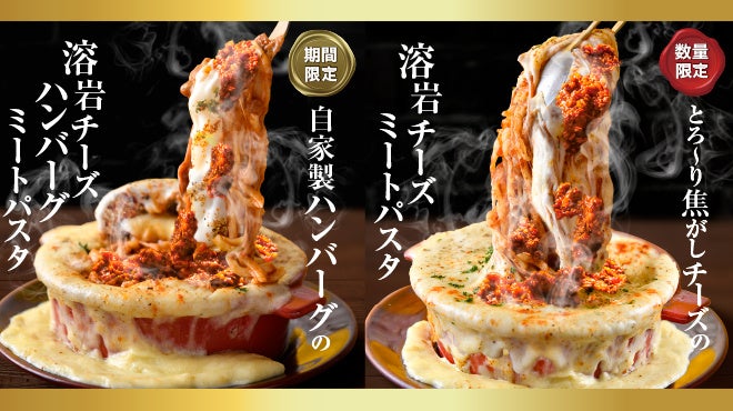 器の外まで溢れ出るとろ~りチーズの中には、溶岩のようにグツグツと沸き立つ肉厚ハンバーグとモチモチ食感のパスタがたっぷり。熱々のハンバーグをお好みの大きさに崩せば、旨み溢れる肉汁が溢れ出し、肉感たっぷりミートソースの出来上がり。豪快にかき混ぜてトングでつかみ上げれば、まさに噴火のような衝撃のインパクト!