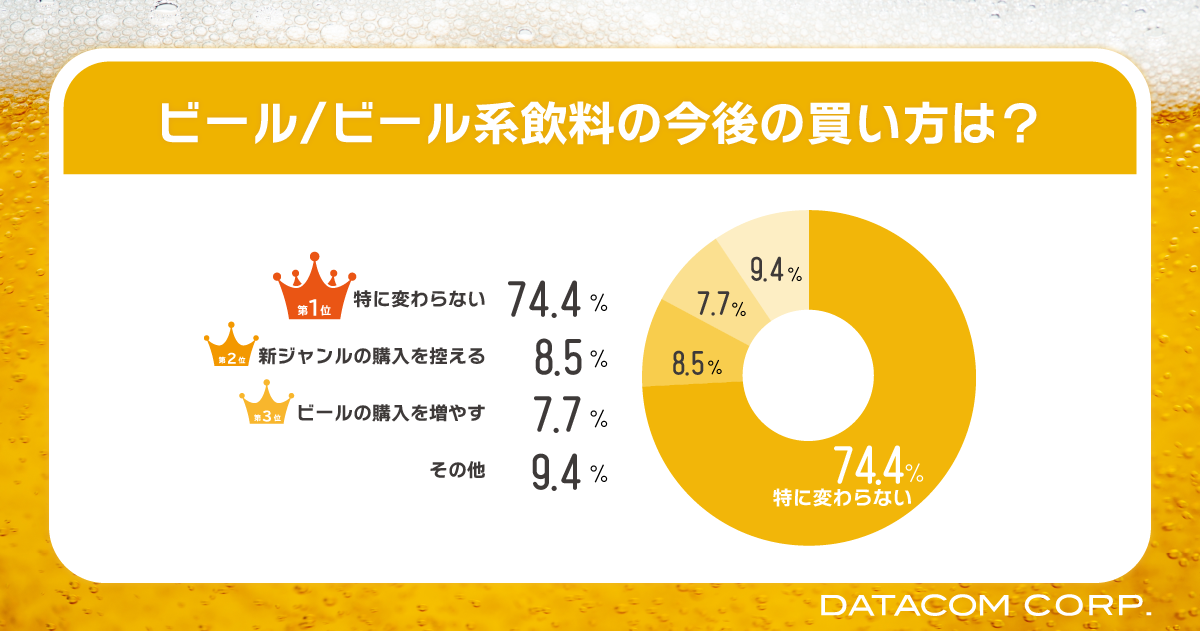 月1回以上ビール系飲料を飲むと答えた人を対象に、「2023年10月の酒税法改正に伴う、今後のビール系飲料の買い方について教えてください」と聞いた所、「特に変わらない」の回答が74.4%で1位になりました。また、最も購入するビール系飲料として、税率増加対象の”発泡酒”、または”新ジャンル”を選択した人に絞った場合でも、購買行動を変えると答えた人は25%の人に留まりました。本結果から今回の酒税改正では、消費者が購買行動を大きく変えることは無いものと推測されます。