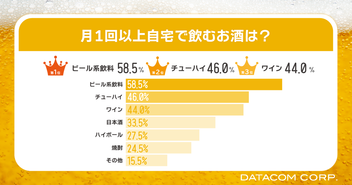 「月1回以上、自宅で飲むお酒は?」という質問に対しての回答で、最も多かった回答は「ビール系飲料」で58.5%、2位「チューハイ」46.0%、3位「ワイン」44.0%と続きました。中高年〜シニア層が自宅で飲むお酒は、ビール系飲料が一番多いことが判明しました。