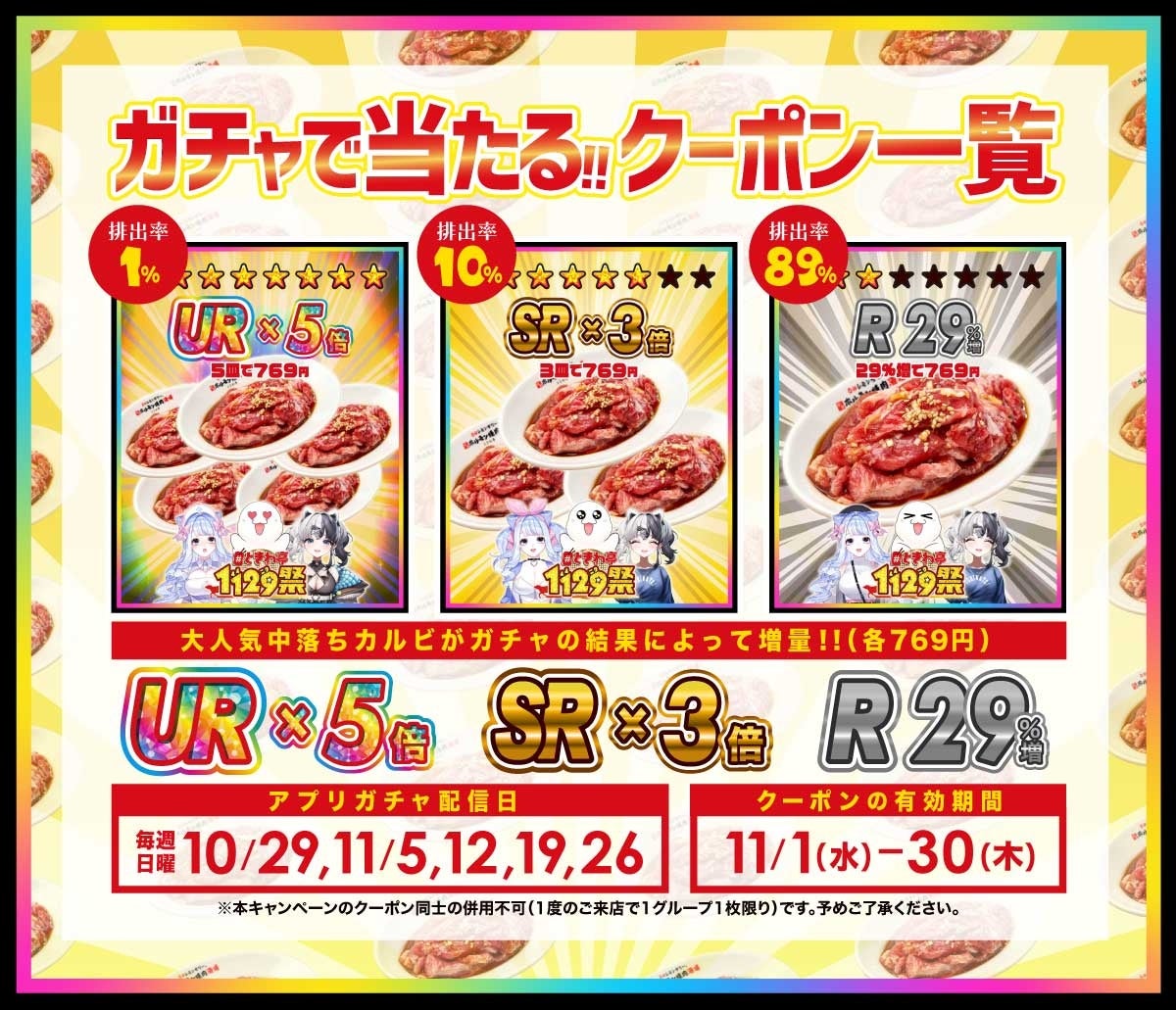 この度、10月29日(日)〜11月30日(木)の期間限定で、『#ときわ亭1129(いい肉)祭』キャンペーンを開催いたします。10月28日(土)時点でアプリ会員の方と、11月1日(水)〜11月30日(木)の期間に新規会員登録していただいた方に、キャンペーン期間中に使えるクーポンが当たるガチャチケットをアプリから配信します。大人気の「中落ちカルビ」が増量されるクーポンで、1等は5倍カルビ、2等は3倍カルビ、3等は29%増の充実ぶりでハズレなしです。