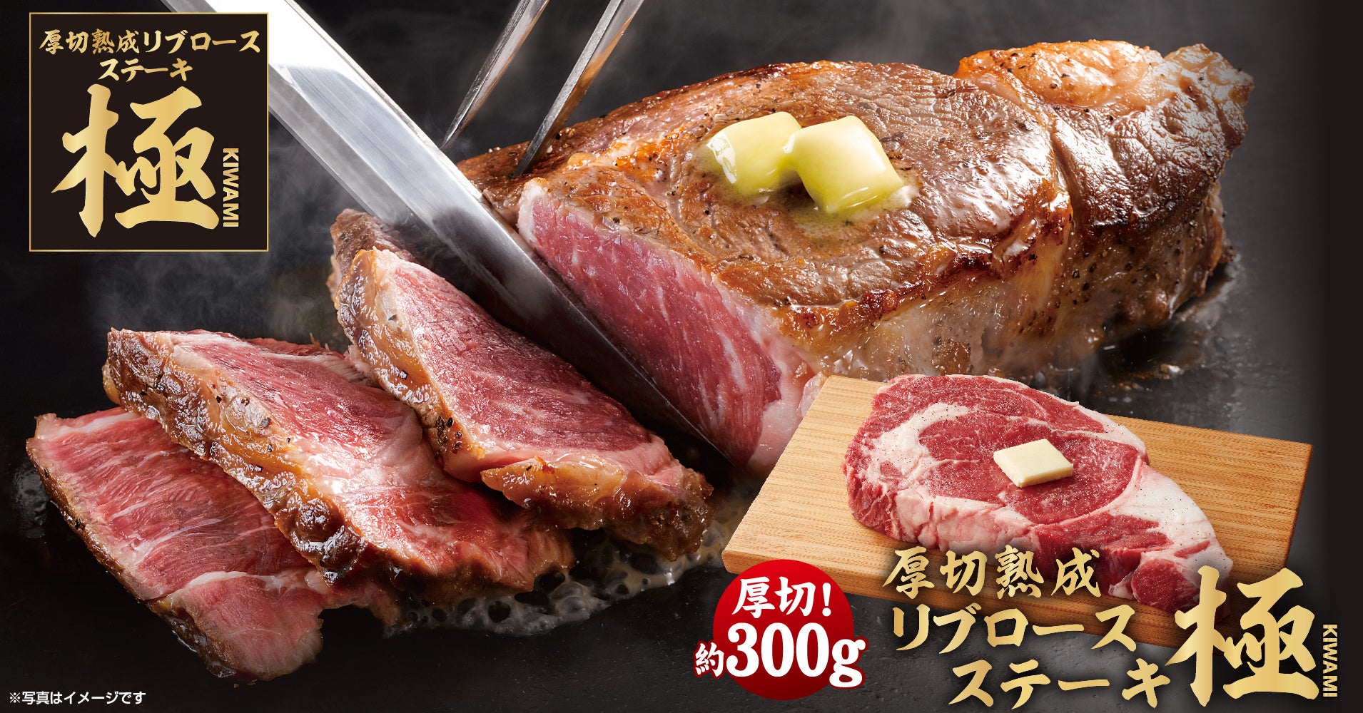 赤身とジューシーな脂身の美味しさが詰まった新商品「厚切熟成 リブロースステーキ極」(税抜3,280円/税込3,608円)が、「プレミアムステーキコース(3,580円/税込3,938円)」で食べ放題でお召し上がりいただけます。このコースでは『お好み焼本舗』で人気の「お好み焼」や「串カツ」は勿論、すべてのメニューが食べ放題でお楽しみいただけます。