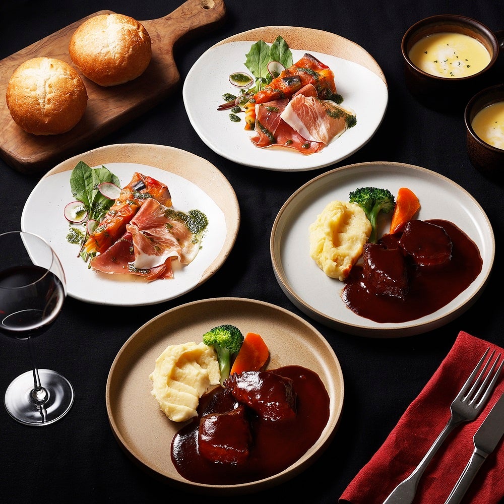 セット内容:黒毛和牛のビーフシチュー ×2、コーンポタージュスープ ×2、野菜のゼリー寄せ~バジルソース添え~ ×1、プロシュートスライス ×1、キタアカリのマッシュポテト ×1、ブール×2、