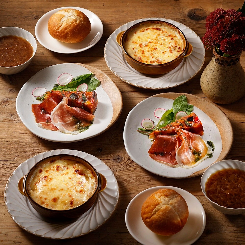海老の旨みが味わえる「ごちそう海老グラタン」と定番の「フレンチ オニオンスープ」に、爽やかな酸味と甘みのある冷製オードブルが セットになった冬のディナーにぴったりのセットです。いつもより特別