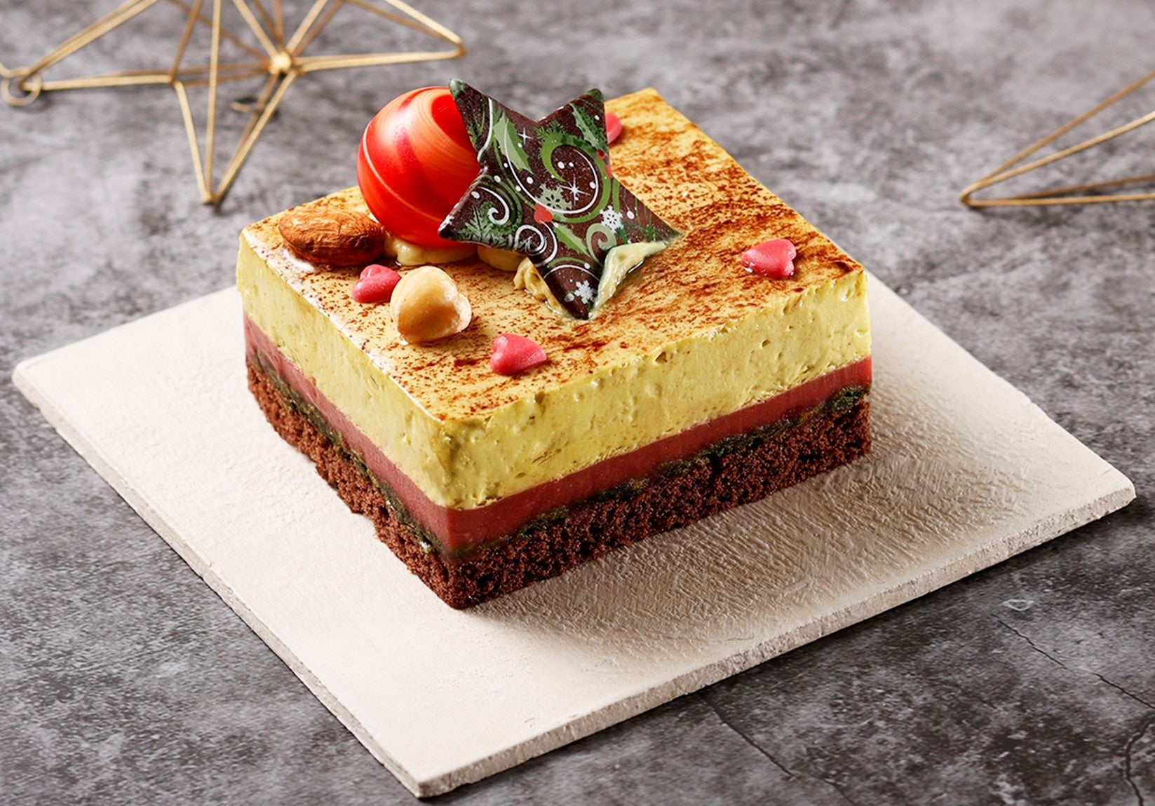 ココア生地と甘酸っぱいフランボワーズクレームにピスタチオの風味 が広がるムースを合わせた3層のケーキです。ショコラ×ピスタチ オ×フランボワーズの組み合わせをお楽しみください。