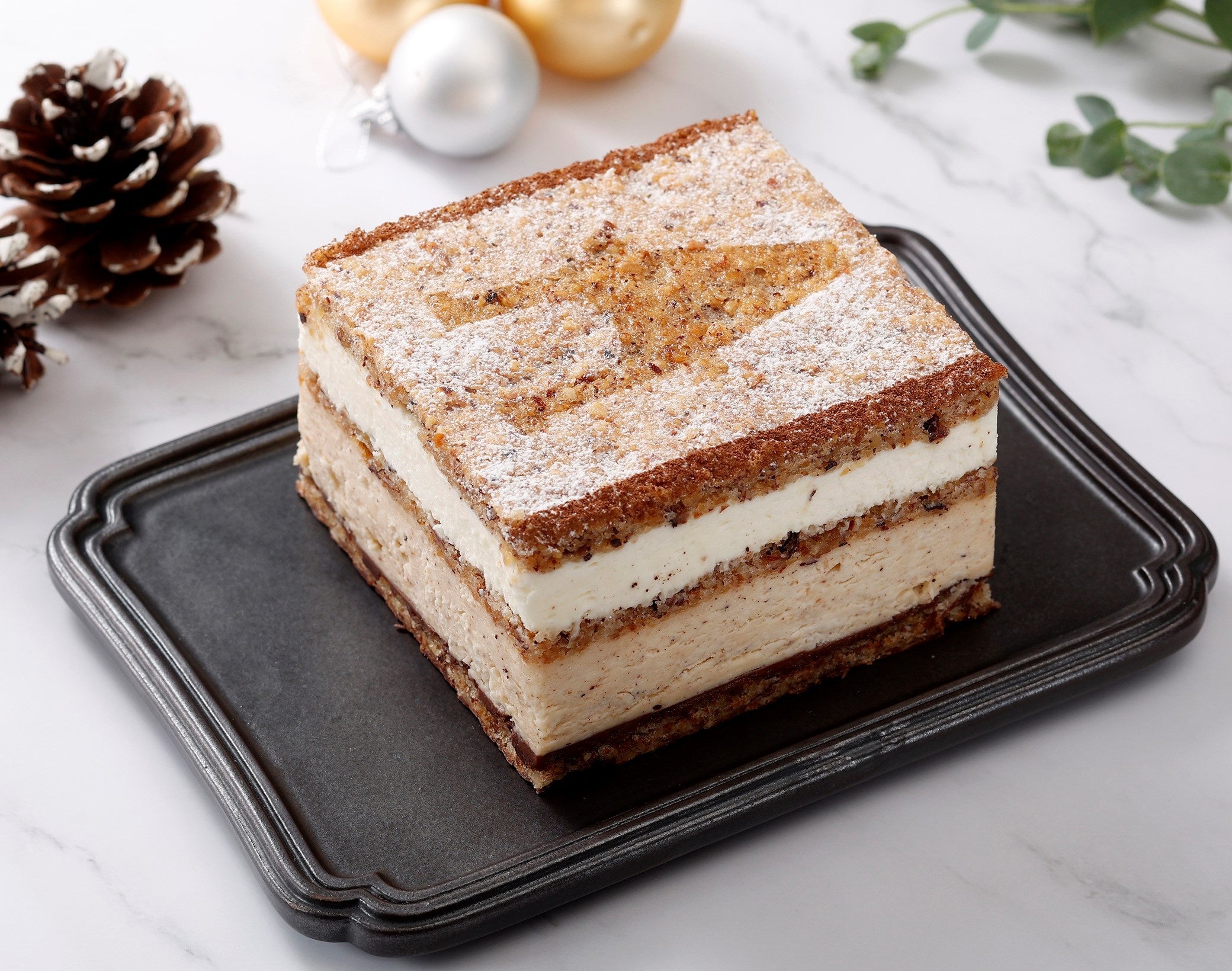 ヘーゼルナッツプラリネのムースと生クリームをアーモンドとヘーゼルナッツのシュクセ*1でサンドしました。香ばしいナッツと生クリームが楽しめるフランス生まれの伝統菓子です。