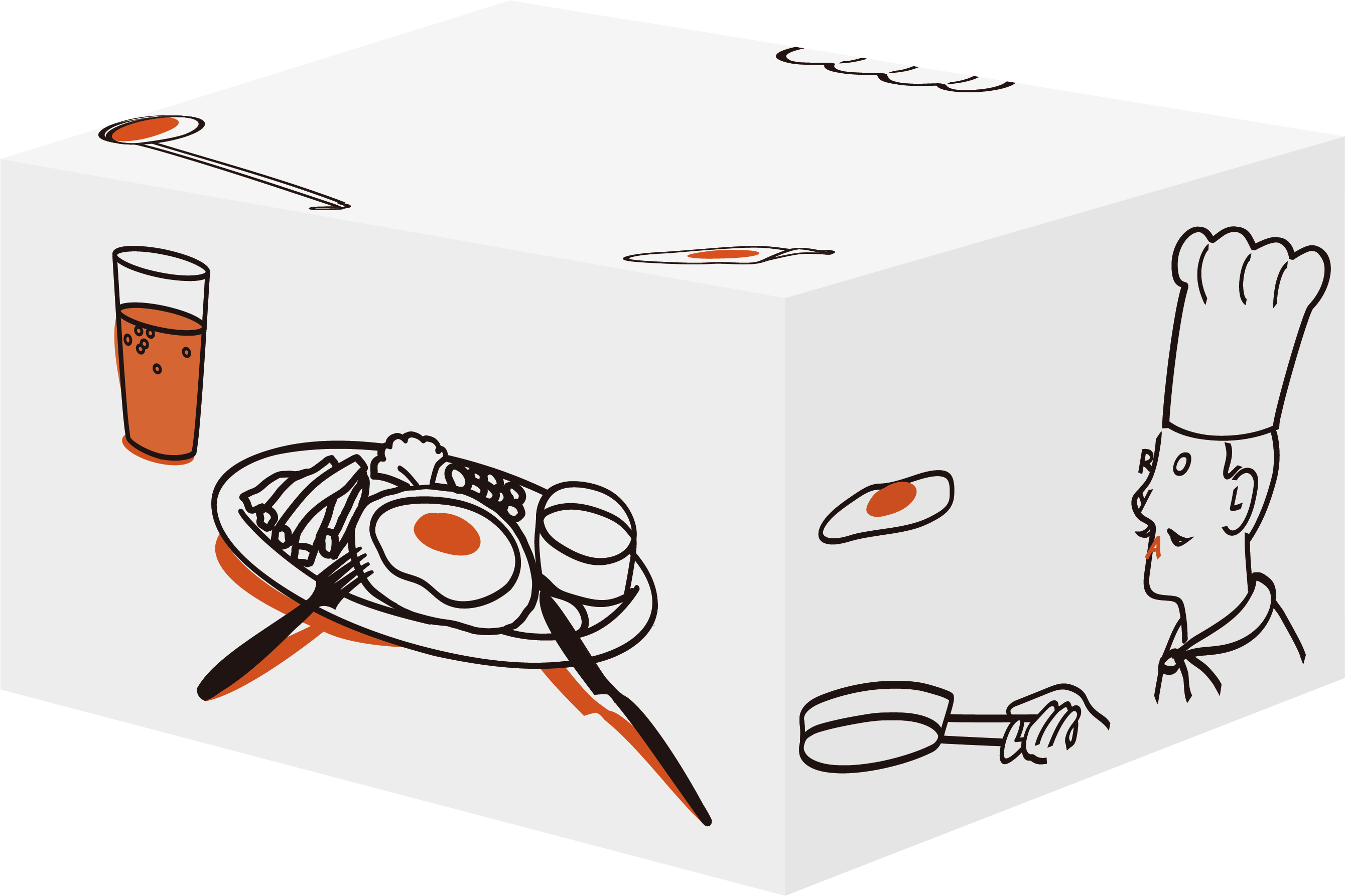 それらをベースにしつつ、贈りたくなるような、届いたら嬉しくなるような、ギフトボックスとしてデザインをしました。 ボックスの直方体の形状を利用して、どの面を見ても楽しめるよう、ロイヤルデリのあるシーンをストーリー的に表現しています。