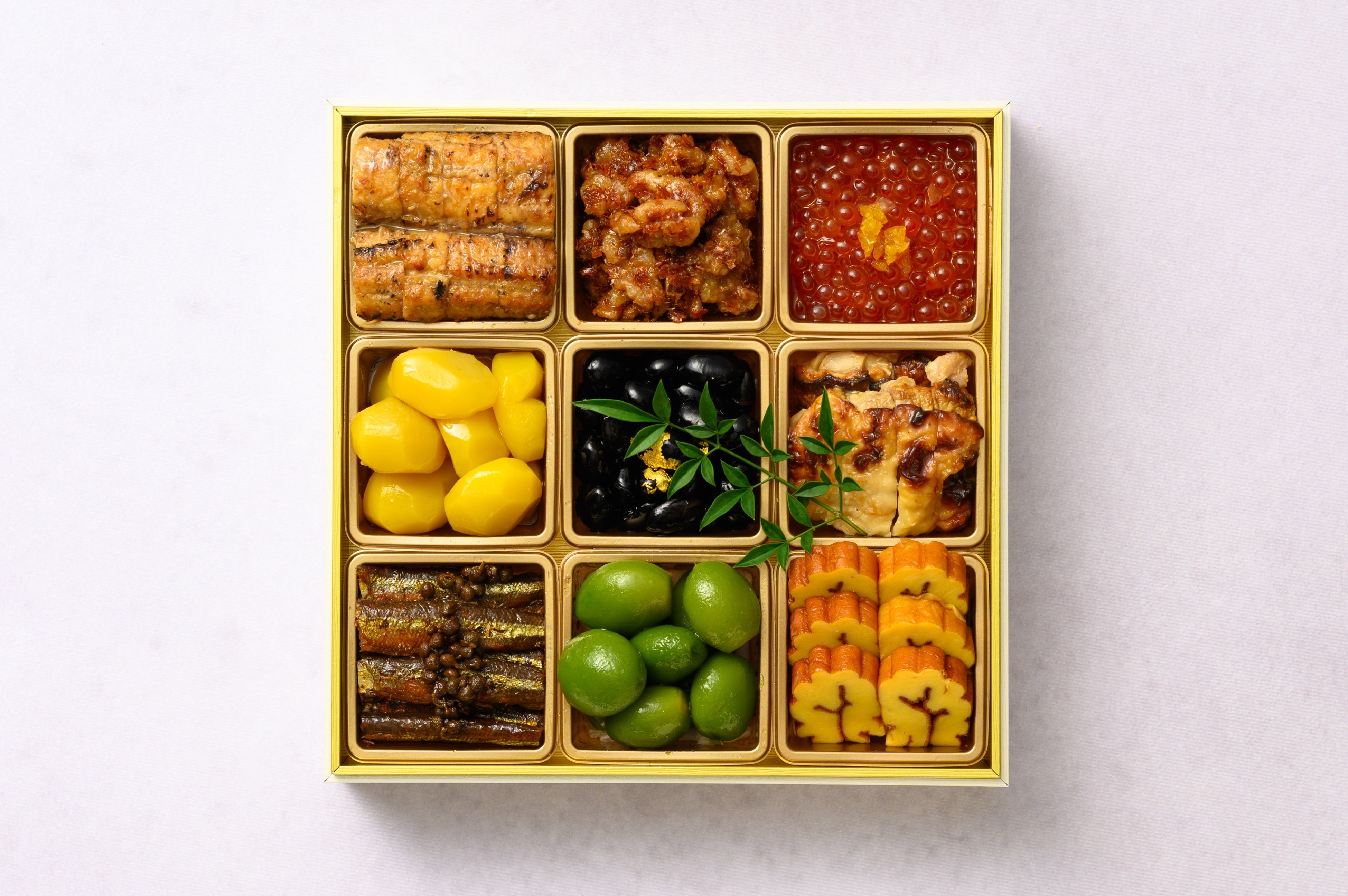 鰻と玉子の焼きもの/かつお胡桃の照り煮/柚子いくら漬け/栗きんとん/丹波ぶどう豆 赤ワイン味/ありた鶏の味噌焼き/わかさぎの有馬山椒煮/若桃甘露煮/メープル香る伊達巻