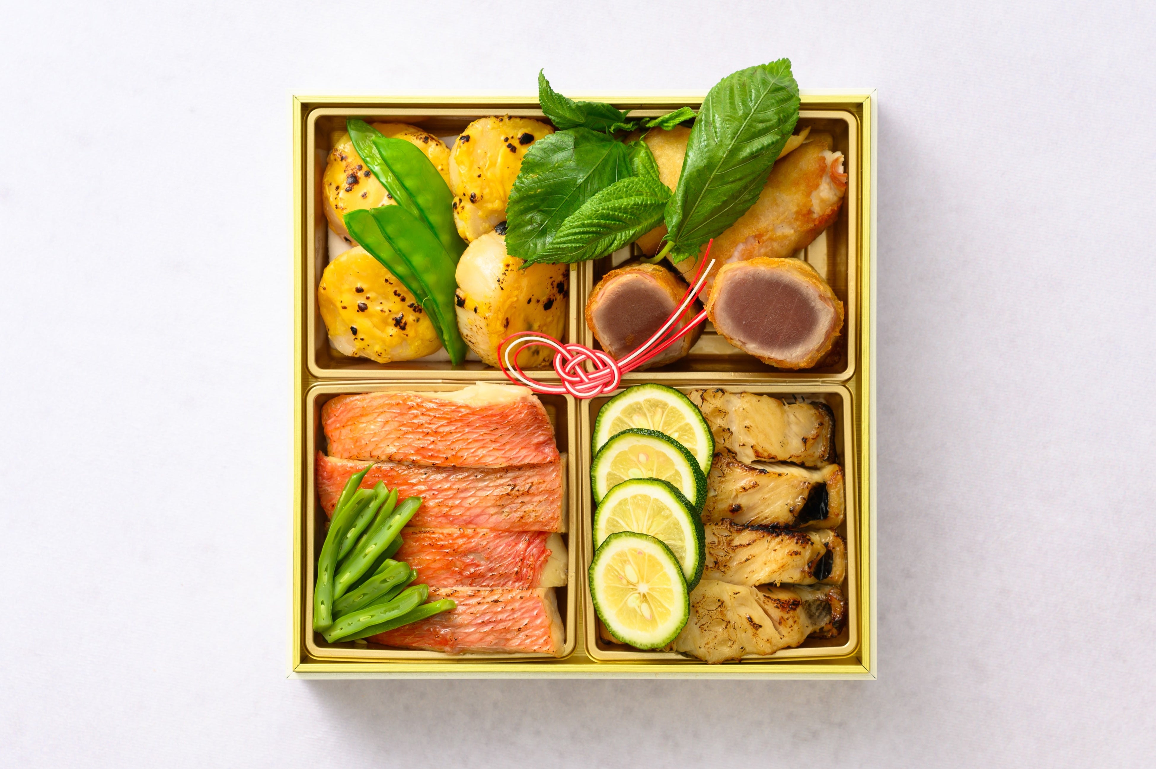 黒毛和牛八女玉露塩ローストビーフ/黒豚八海山酒粕漬け/比内地鶏塩麴炙り焼き/北海道産鴨胸醬油麴スモーク/若桃甘露煮/梅ちらし 青串