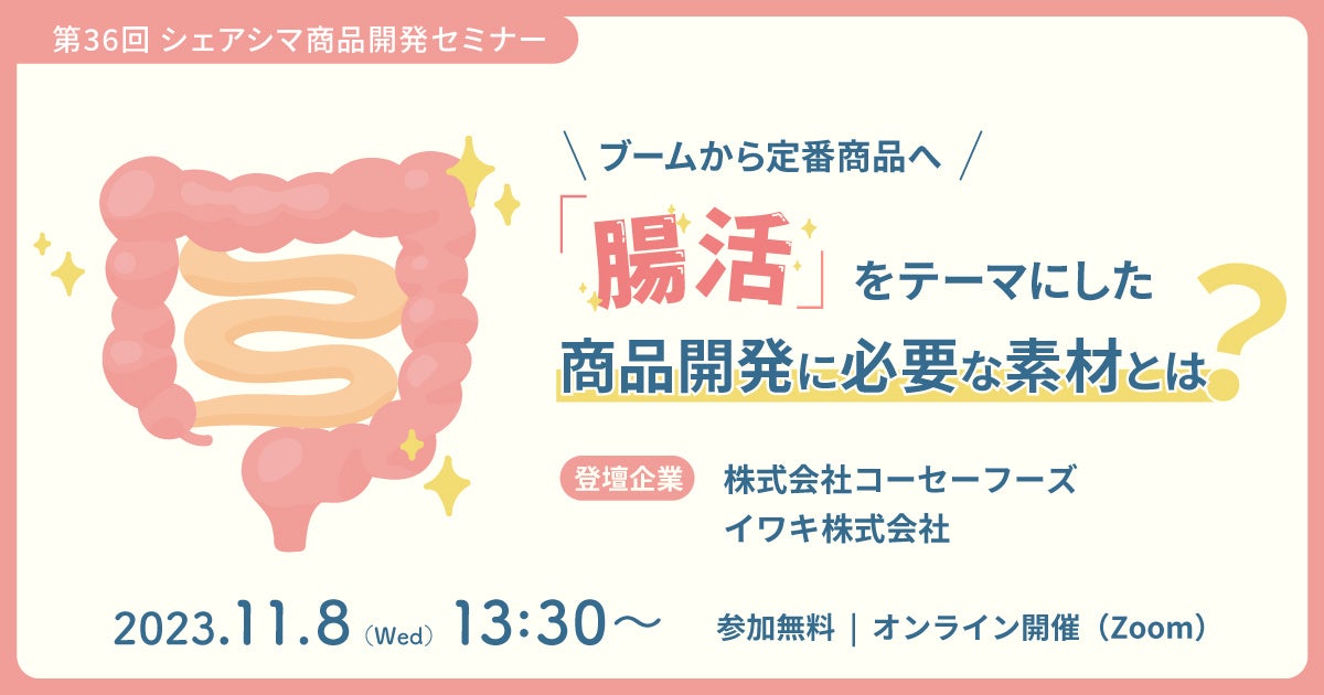 2023年11月8日(水)に開催する第36回セミナーは、『ブームから定番商品へ「腸活」をテーマにした商品開発に必要な素材とは?』がテーマです。消費者の健康意識の高まりに後押しされて、「腸活」はブームから定番へとなりつつあります。免疫力の向上や健康維持に大きく貢献する、腸内環境の改善に役立つ食品素材と効果的な活用方法について、各社よりご紹介いただきます。独自の技術や機能性について、余すところなく聞けるこの機会をぜひお見逃しなく!
