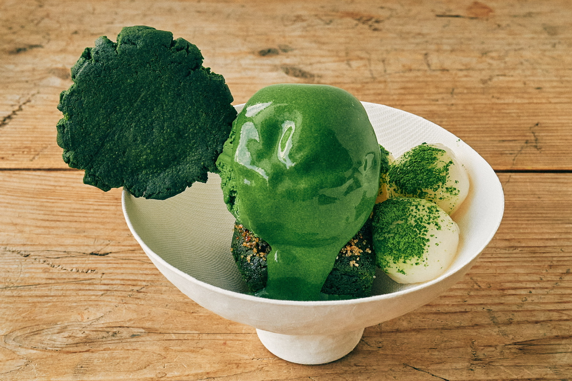 実演で作り上げる抹茶ラテに自家製アイスクリームを乗せました。ブレンドの抹茶を使用しており、苦味や旨みのバランスは奥行きのある味わいです。抹茶ラテフロートや八十八プリンにも「八十八クッキー」「フィナンシェ」をトッピングできます。