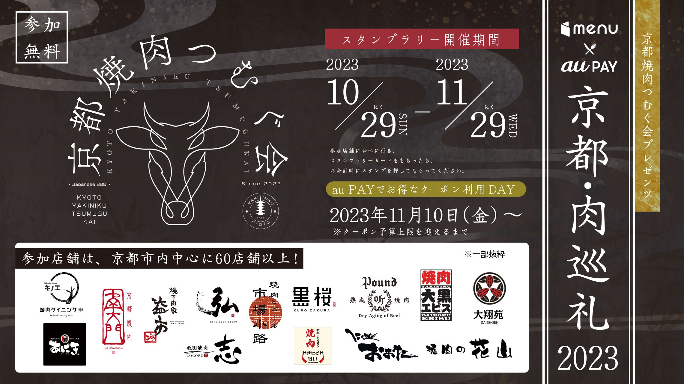 「京都焼肉つむぐ会」主催により、京都市に店舗を構える肉の名店、63店舗が参加。menuと電子マネーサービスau PAYをご利用いただくことでお得に楽しめる他、豪華景品が当たるスタンプラリーも実施します。