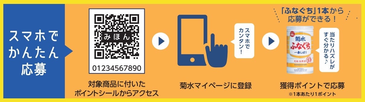 当キャンペーンは、対象商品「菊水ふなぐち 200ml」に貼付されているシールのポイントを集めて、WEB上で簡単に応募ができます。抽選の結果はその場でわかり、総勢630名様に菊水オリジナルふなぐちグッズをプレゼントいたします。