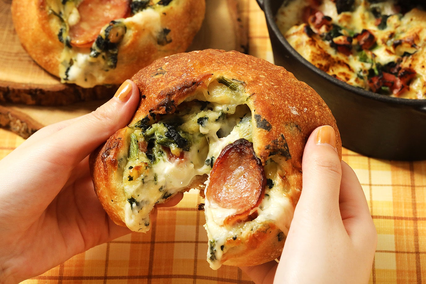 こだわり:人気商品『のび〜るとろりんチーズフランス』の冬季限定商品。ほうれん草を練り込んだ生地の中に、ほうれん草とベーコンが入ったオリジナル配合のホワイトソースとチーズを包んで焼き上げました。ほうれん草の旨味とチーズのコクが寒い冬に食べたくなる、グラタンのようなチーズフランスです。