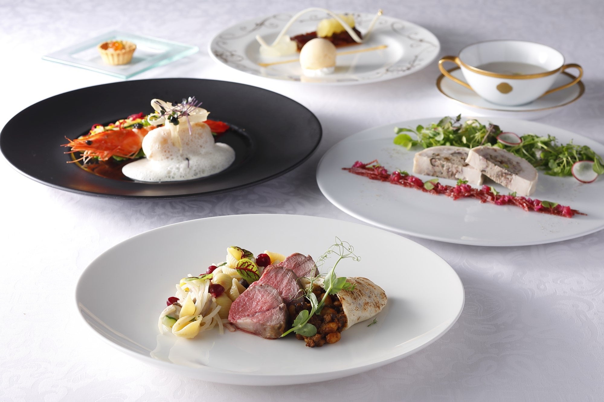 前菜からデザートまでお好みのメニューをお選びいただけるシェフのおすすめコース。メインには海老や帆立貝、鯛などを使った魚介類の料理と、ジビエなどを使った肉料理をご用意しました。仔羊のローストのひと皿には、ジビエとレンズ豆のラグーをぎっしりと詰めたピタパンを添えました。あたたかなスープやデザートと合わせ、この時季にお楽しみいただけるおすすめのコースです。