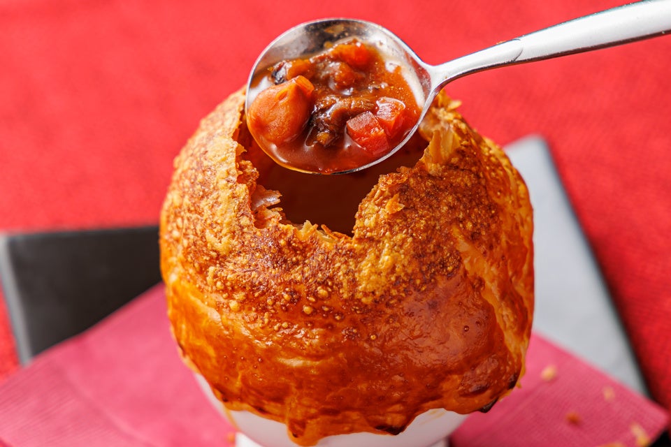 パイで包んで焼き上げた河内鴨とビーツの真っ赤なスープ