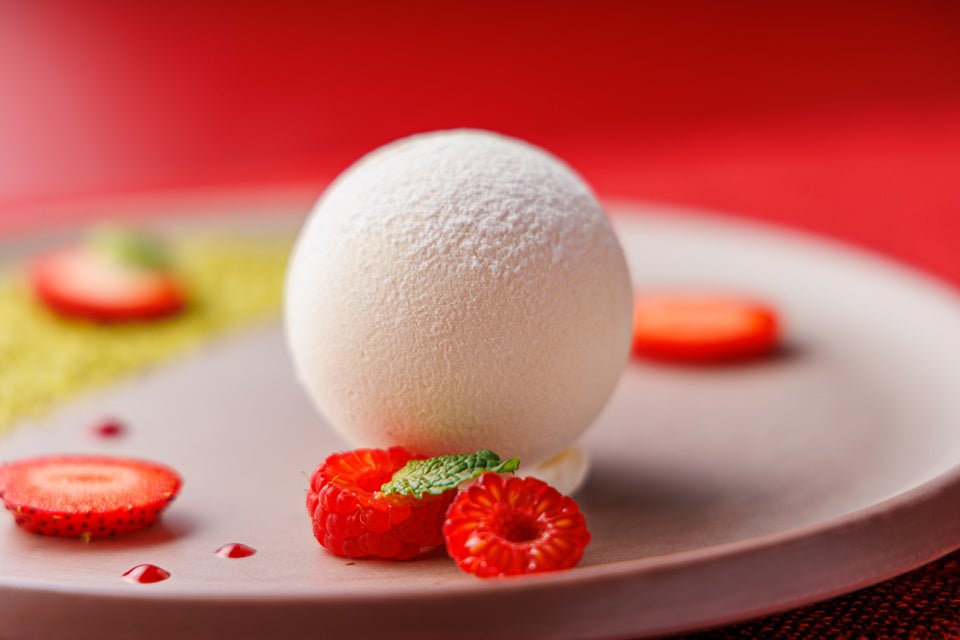 また物語の締めくくりとして、ドライフルーツやショコラ等が入った生クリームたっぷりのふんわりしたアイスを焼いたメレンゲで覆い、オーナメントをイメージしたデザート“ヴァシュラン”をご提供いたします。