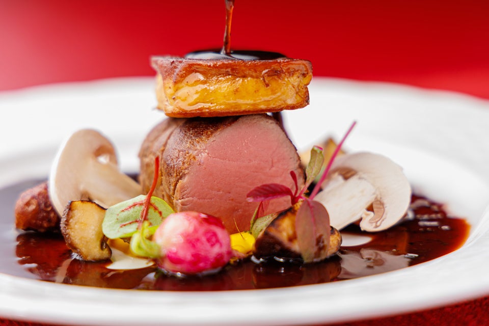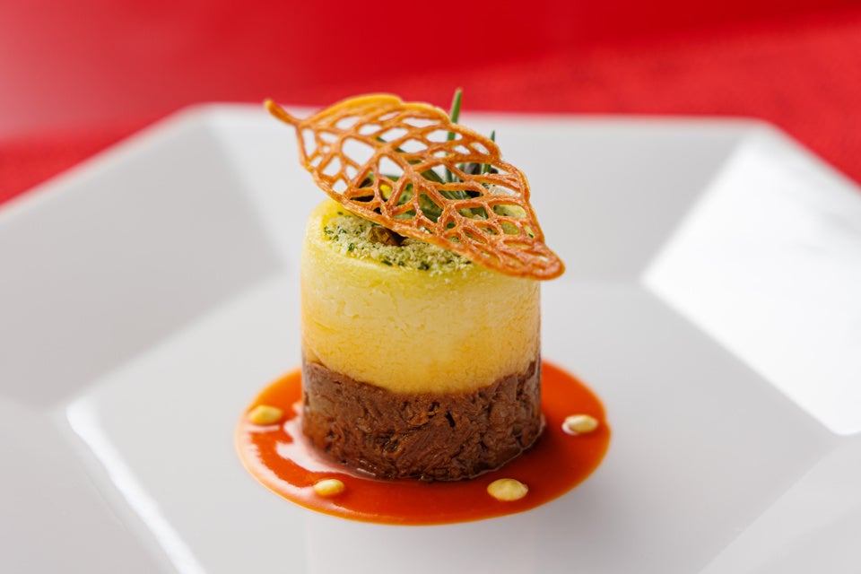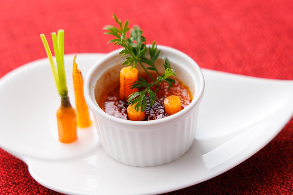 物語のはじまりは、サンタクロースの大好物“人参のクリームブリュレ”。今回の主人公・人参好きのサンタクロースをイメージしたアミューズから始まります。前菜にはリンゴのコンポートとカリフラワーのグレックを土台にハーブでマリネした七面鳥のムースとフレッシュフルーツ、根菜のピクルスでホワイトクリスマスツリーを表現した“七面鳥のムースとリンゴとカリフラワーのアンサンブル”などをご用意します。大阪産河内鴨を使用し、トマトの酸味、ビーツの甘味を加えた“パイ包みのスープ”やノエルカラーが美しく、香ばしく焼いたオマール海老の殻や生姜等を加えた和だしの泡で雪を見立てた“オマール海老と蕪 和エピスと甲殻薫るエミュルション”が続き、メインディッシュを飾る肉料理には、厚切りの牛フィレ肉とフォアグラに黒トリュフを加えたペリグーソースをたっぷりとかけ、添えた温野菜が華を添える“牛フィレ肉とフォアグラのロッシーニ”をお楽しみいただけます。