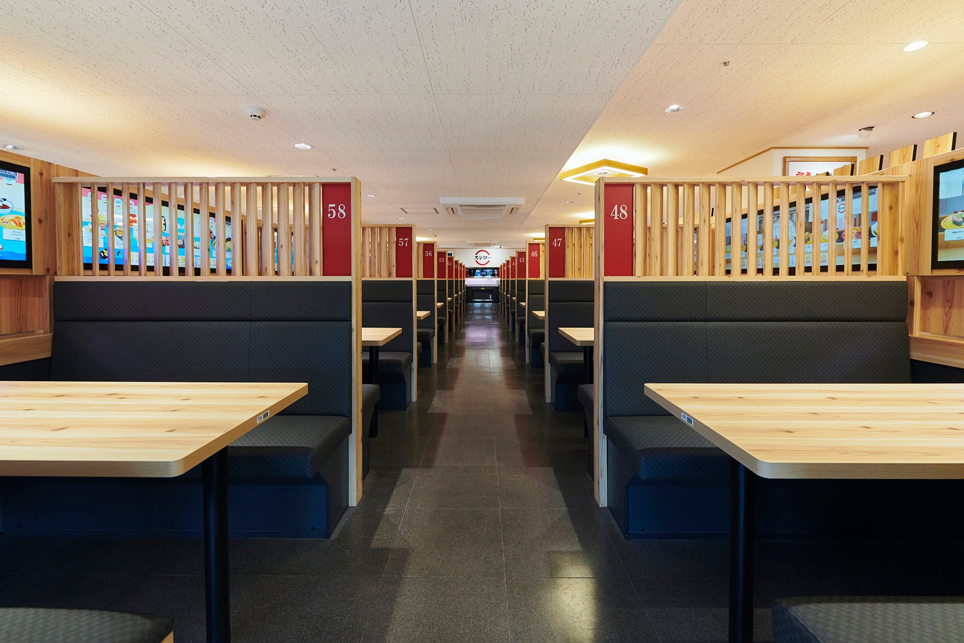 テーブル席は、他の客席や店内の環境から隔離された個室間のある空間にすることで、デジタルな回転ずしの世界に没入できるデザインとしました。