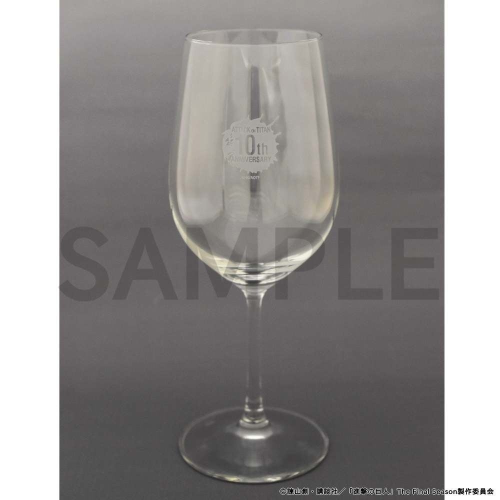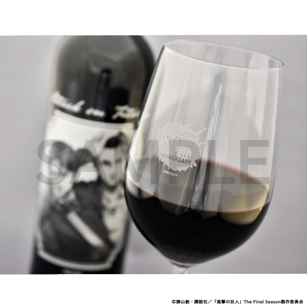 “ATTACK on TITAN 10th ANNIVERSARY”のロゴをあしらったグラスに赤ワインを注ぎ、グラスを傾ければ極上のひと時を過ごせること間違いなし。