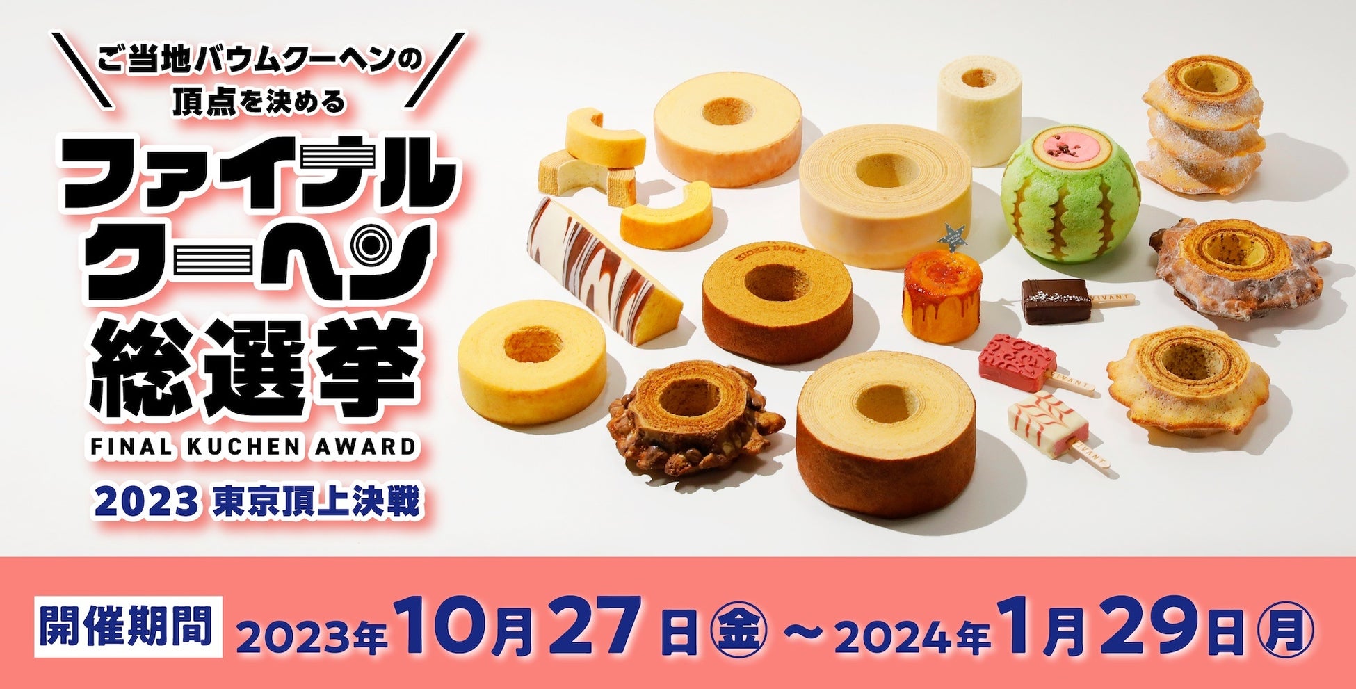 2021年3月より「コロナ禍でも、会場に行かなくても楽しめるイベントを!」という想いから始まった「ファイナルクーヘン総選挙」。昨年9月から11月の「ファイナルクーヘン総選挙2022秋東京頂上決戦」では、58種類のバウムクーヘンがエントリーされ、総得票数27,379票の頂点が決定しました。この度、「~全国ご当地バウムクーヘン2023年のファイナルグランプリを決める~ファイナルクーヘン総選挙2023東京頂上決戦」が開催されます。
