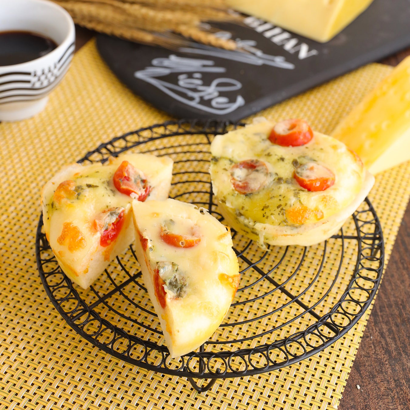 フォカッチャにチェリートマト、バジルソース、モッツァレラチーズを合わせてマルゲリータ風に焼き上げました。