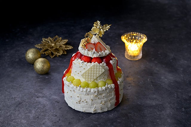 純白に輝くウエディングドレスをイメージした幸せ溢れるクリスマスケーキは、スポンジには「あまおう」をサンドし、デコレーションには静岡県産メロンと愛知県産苺を贅沢に使用しました。