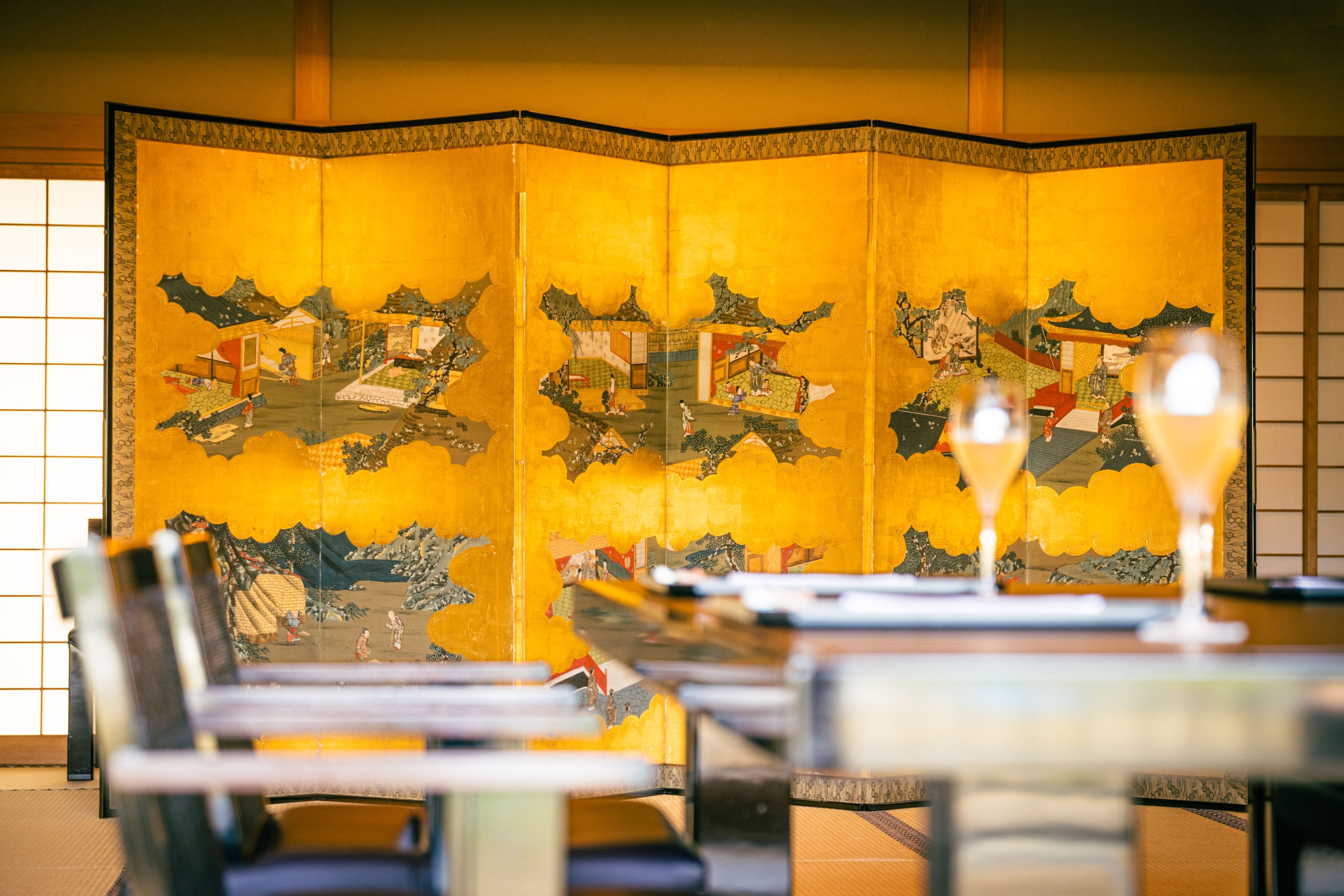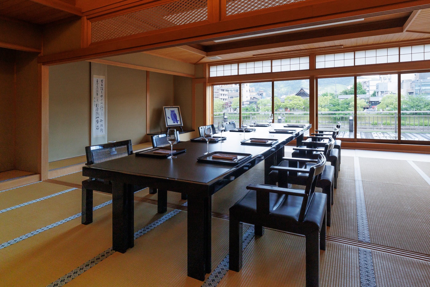 お食事は、鴨川を一望できる広間でご用意致します。テラスにも出ていただくことが可能で、東海道五十三次の西の起点である三条大橋や将軍塚など京都らしい風景をお楽しみいただけます。歴史を感じる贅沢な空間と四季を彩るお料理でゲストの皆様と共に記憶に残る一日をお過ごしください。