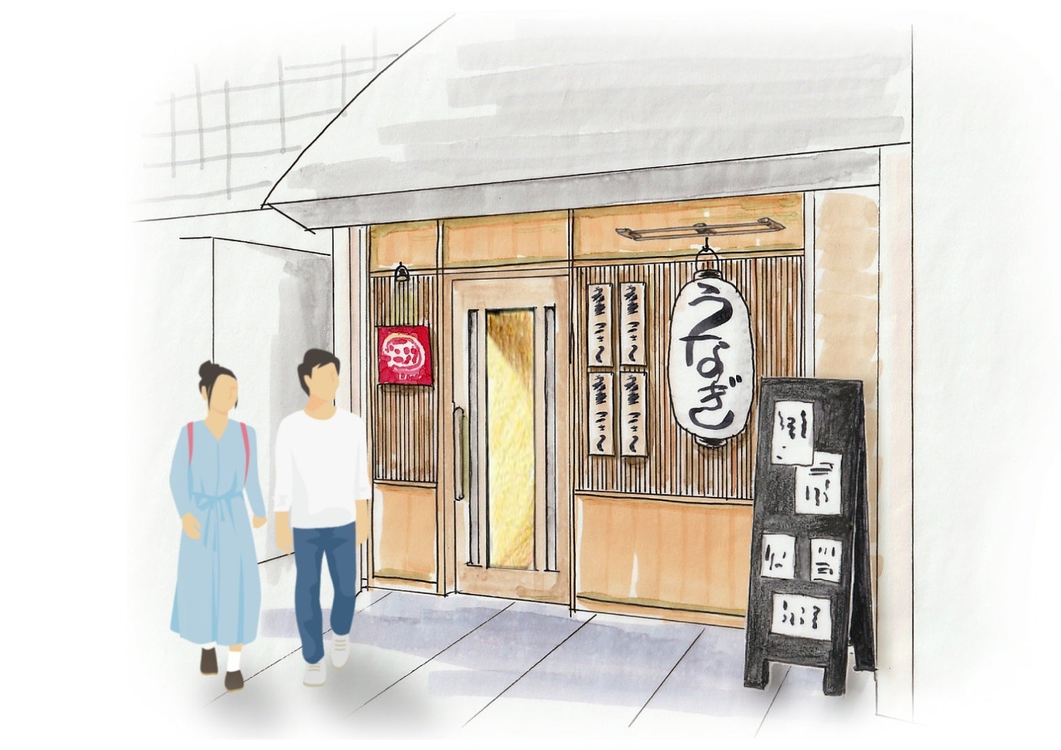 和をイメージした店内では、うなぎ料理の伝統への敬意を払いつつ、全てのお客様が心地よくうなぎを味わっていただけるよう、気軽に立ち入っていただける明るい内装を心がけました。