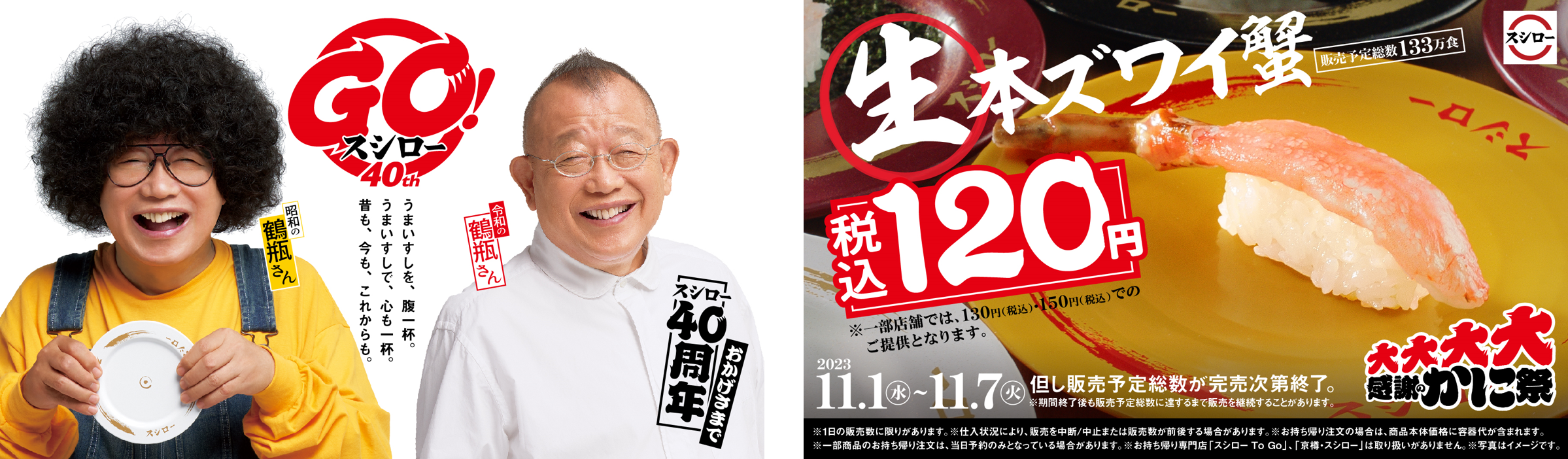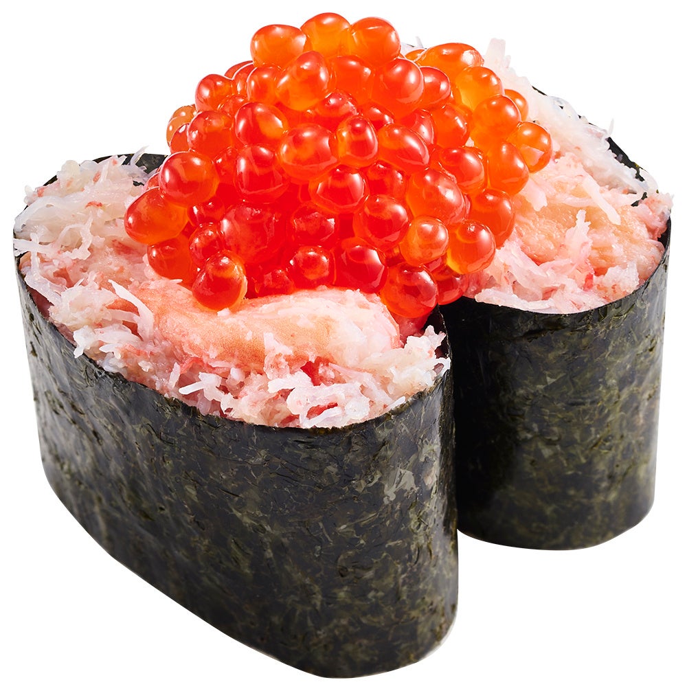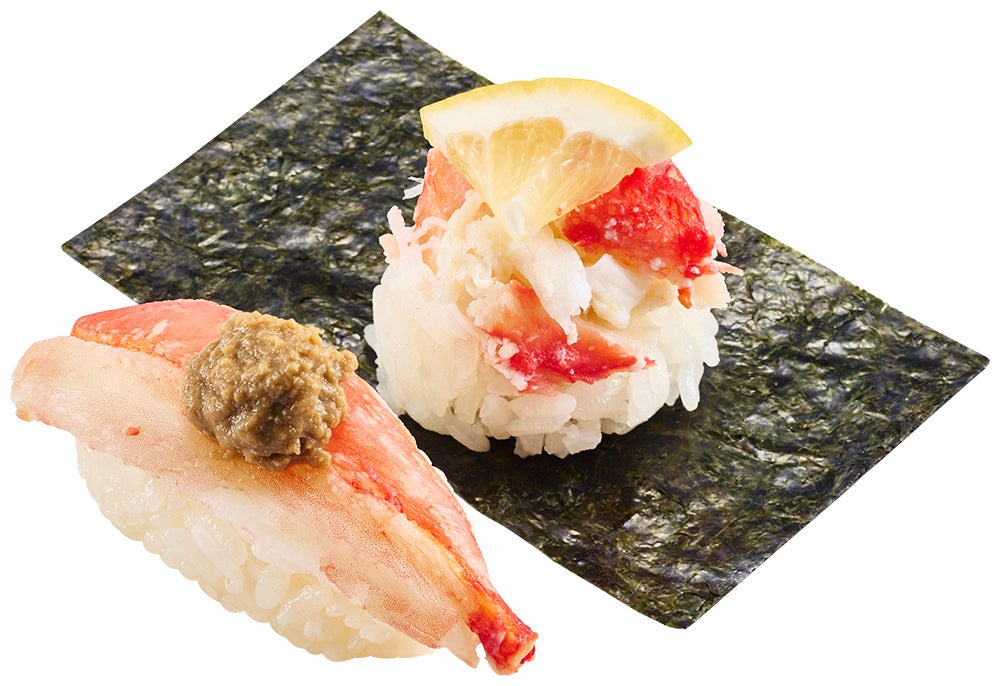 11月1日(水)からは、身質がとろっとしており、甘みも抜群の「生本ズワイ蟹」が一番お手頃な“黄皿”で登場します。さらに“蟹の王様”と言われるタラバ蟹をはじめ、本ずわい蟹や紅ずわい蟹などの様々な蟹をおすしからサイドメニューまでフルコースでお楽しみいただけます。今回の『大大大大感謝のかに祭』では、ほかにもタラバ蟹の身をレモンでさっぱりと楽しめる「タラバ蟹包み」や、スシローオリジナルの数の子松前漬けにかに身を合わせた「かに松前包み」などの創作すしもご用意いたします。さらに、紅ずわい蟹と紅鮭のいくらを一度に味わえる「紅ずわい蟹と紅鮭いくら盛り軍艦」と、タラバ蟹と本ずわい蟹を一皿で堪能できる「タラバ蟹と本ずわい蟹食べ比べ」が登場いたします。