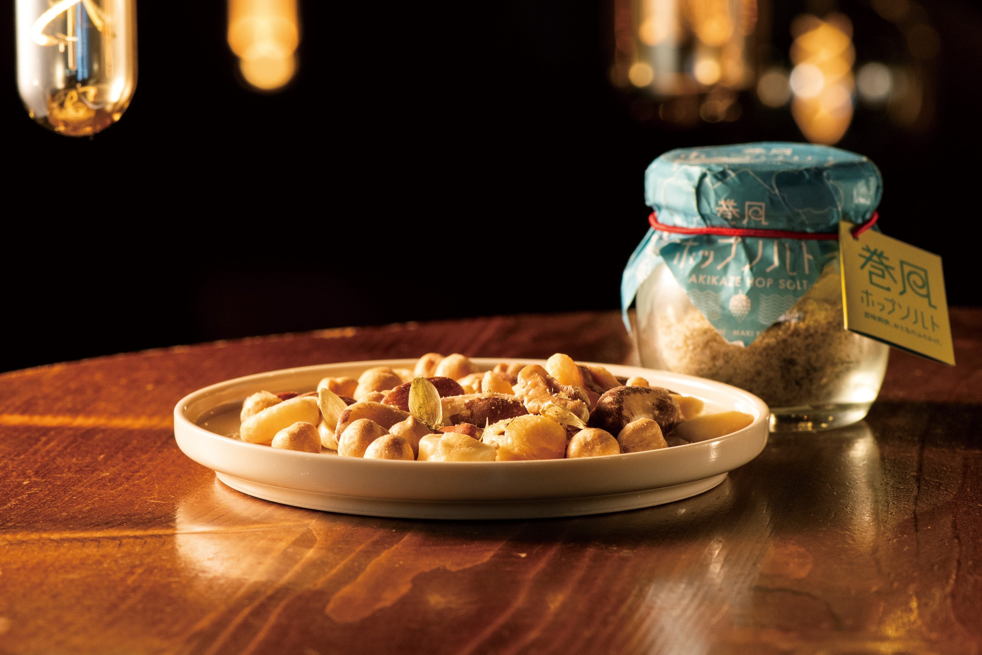 石巻産ホップと金華塩をメインに2種のハーブがブレンドされた「巻風ホップソルト」をふりかけたミックスナッツ。ホップの苦さとハーブの爽やかさで、ビールが進む一品。
