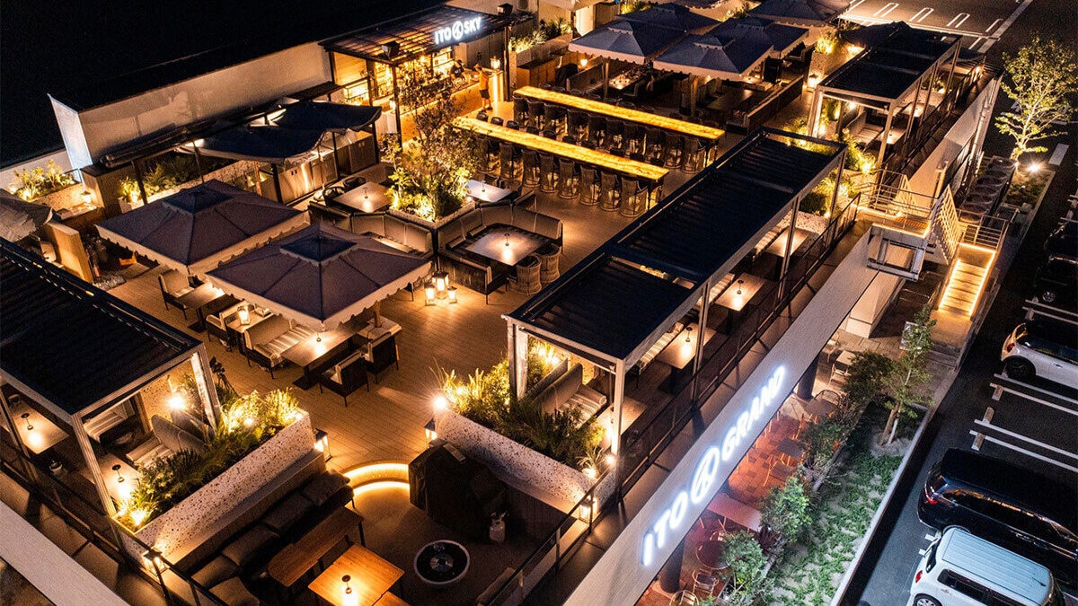 福岡市が進める産学連携プロジェクト「九大新町研究開発次世代拠点」として、2023年にオープンした複合施設「いとLab+」の飲食棟。九大農学部附属農場とのコラボメニューなど、産学連携を食の分野にて実践。3000本のワインセラーやイタリアン、和食、タイ料理、韓国料理などの8業態が並ぶフードホール(1階)と、総面積544㎡と日本最大級の広さを誇るルーフトップ「ITO SKY」(計9業態)