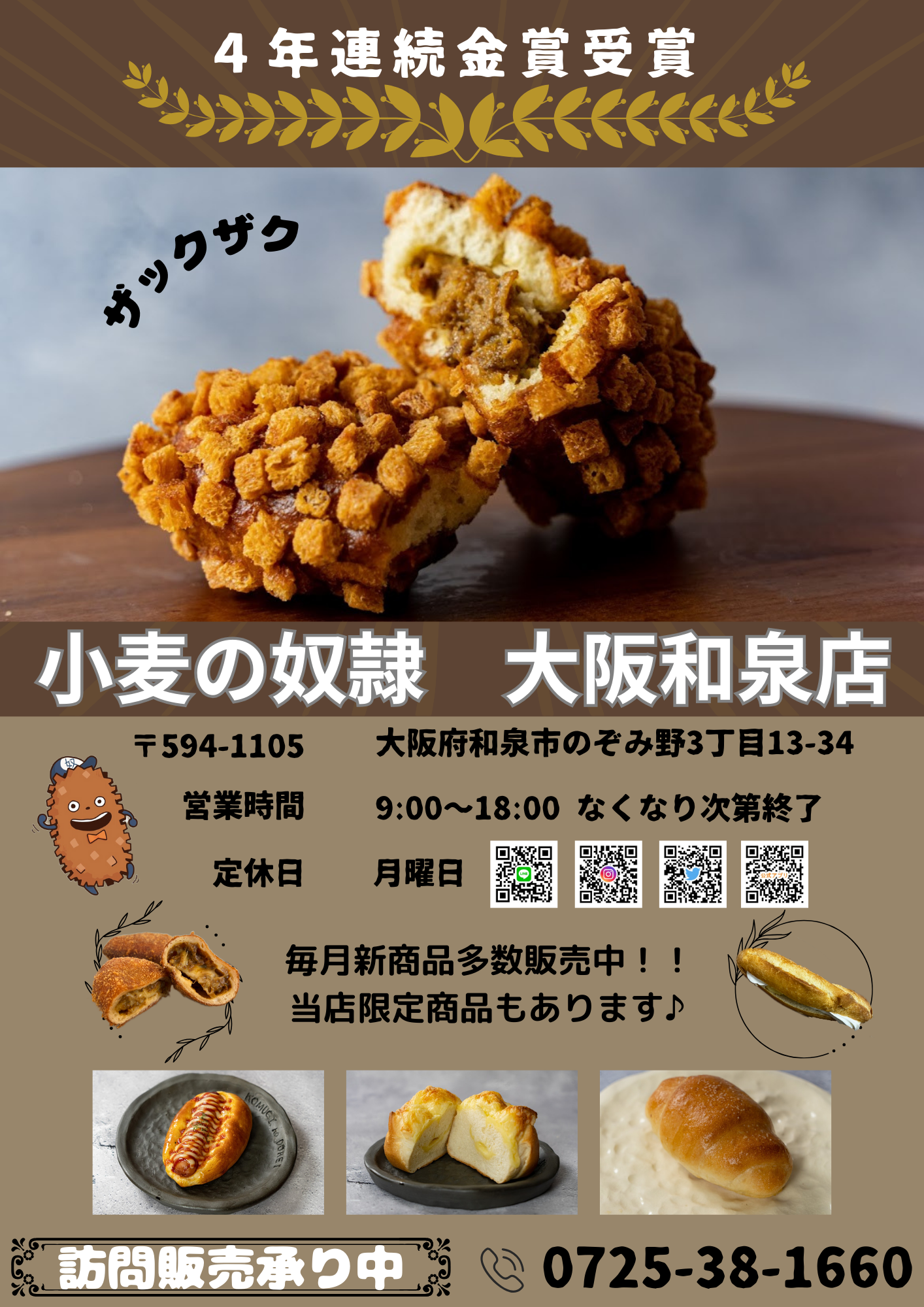 「いつも【小麦の奴隷 和泉店】をご愛顧いただきありがとうございます。当店は、お客様に支えられ開業1周年を迎えます。グランドオープン時は行列ができ、それが3か月続いたことに大変感謝しております。また、訪問販売では地域の企業様やお客様が毎回心待ちにしてくださり、嬉しいお言葉をかけてくださることが励みになっています。これからも皆様に愛されるお店でいられるよう、努力してまいります。これからもどうぞよろしくお願いいたします。
