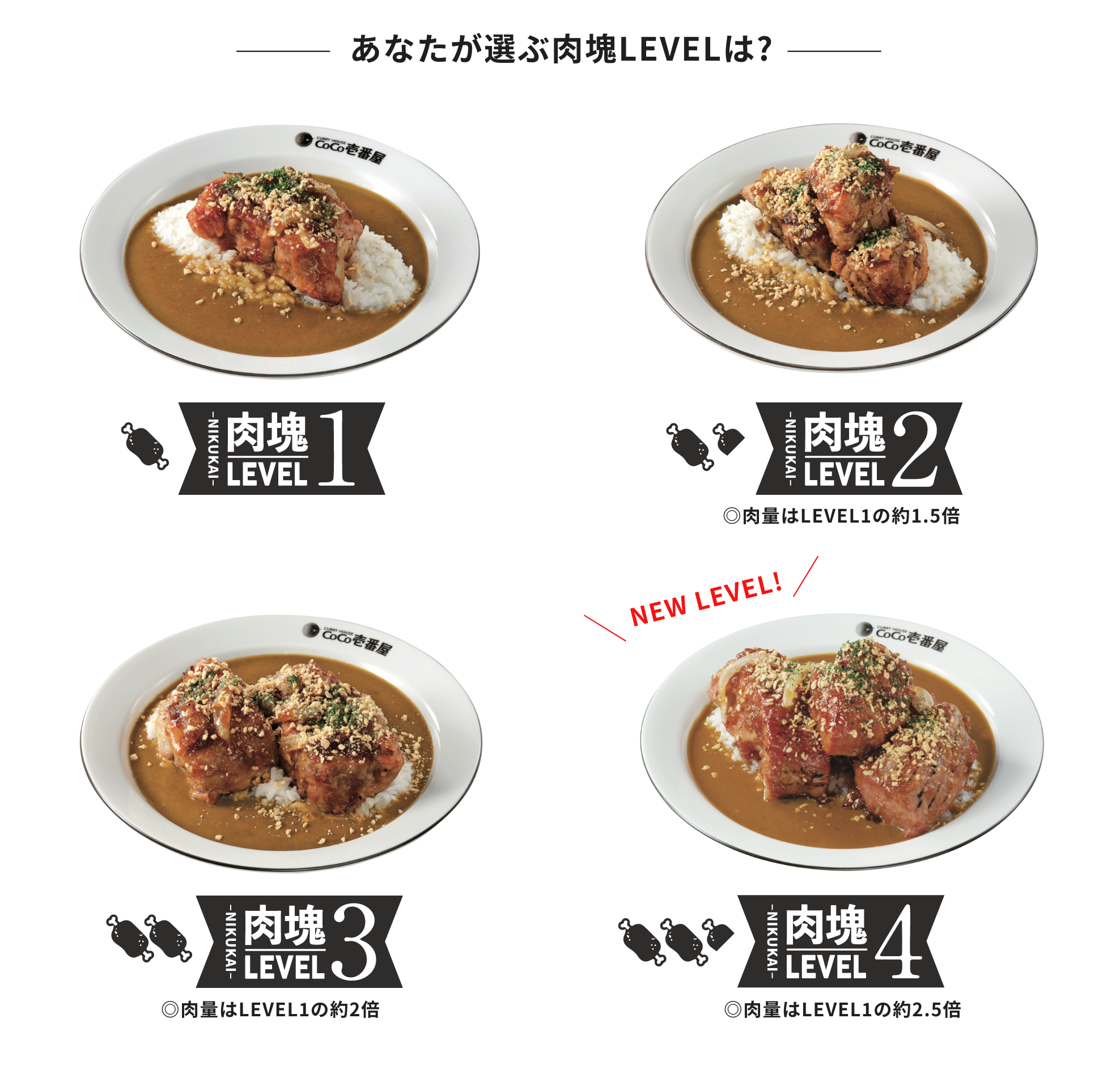 再販にあたり、LEVEL1~3までとしていた「肉塊LEVEL」に、新たにLEVEL4を追加いたしました。肉塊の量はLEVEL1の約2.5倍。前回、「ライス量を増やすと肉塊が足りなかった」というお客様は、LEVEL4のオーダーもご検討ください。