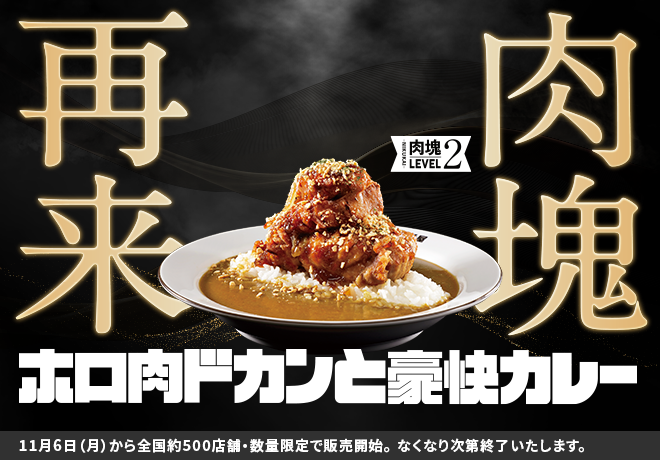 「ホロ肉ドカンと豪快カレー」は、今年4月にナナシカレーとして期間限定・店舗限定で販売し、同時に公式ホームページ上にて開催した「新メニュー名総選挙」で、お客様の投票により正式な名前が決定した限定メニューです。ココイチ史上最大の肉塊を使用した見た目のインパクトや、ご注文時に肉塊レベルをお選びいただく「肉塊オーダー制」などで話題を呼び、メニュー名が決定する前に完売店舗が続出いたしました。